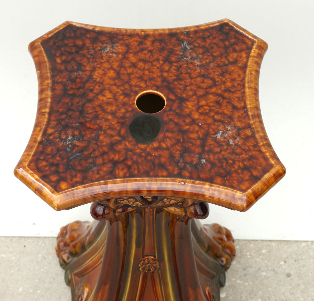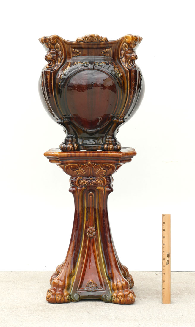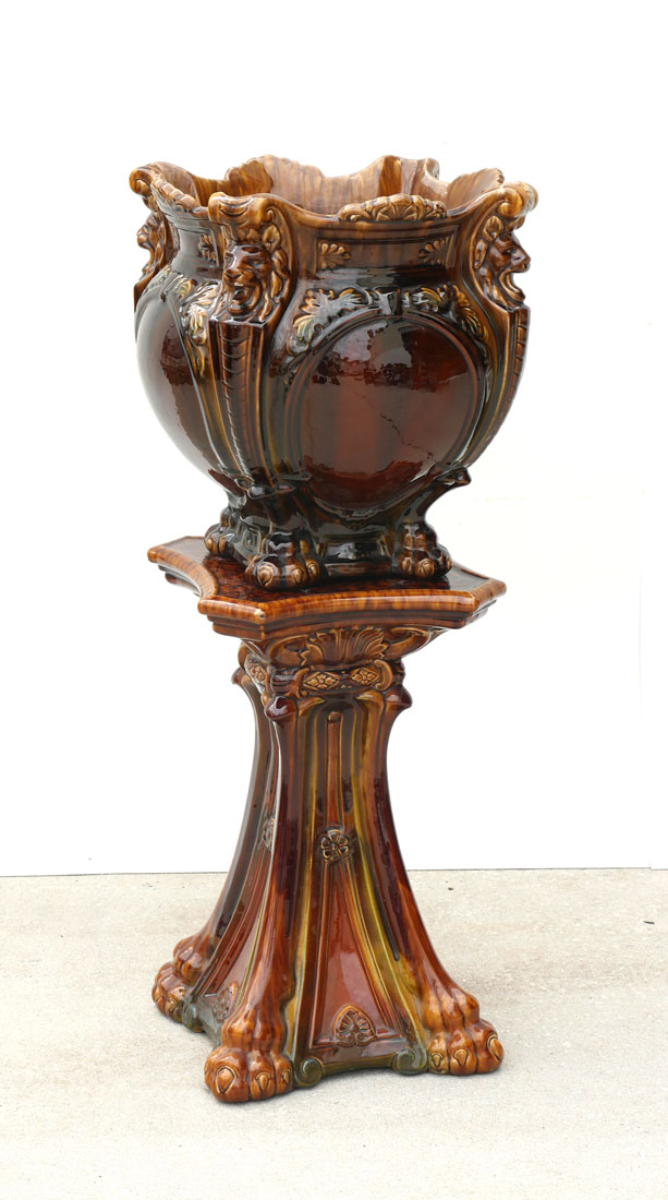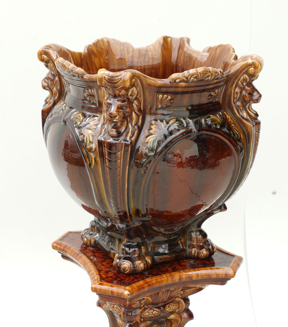MAJOLICA JARDINIERE AND PEDESTAL: The ceramic art Jardiniere and pedestal are finished in a variegated brown glaze with Lion heads and Lion paw footing. Pedestal is approx. 20.75'' h x 12.75'' w. Jardiniere is approx. 16'' h x 14.825'' w.