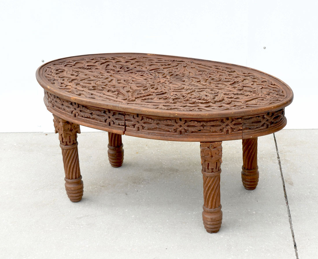 INDO-PERSIAN CARVED OVAL TABLE: Ornately carved Indo-Persian oval table decorated with a scrolling foliate design on spiraled legs and graduated footing. Approx. 20.25'' h x 43'' l x 25.25'' w.