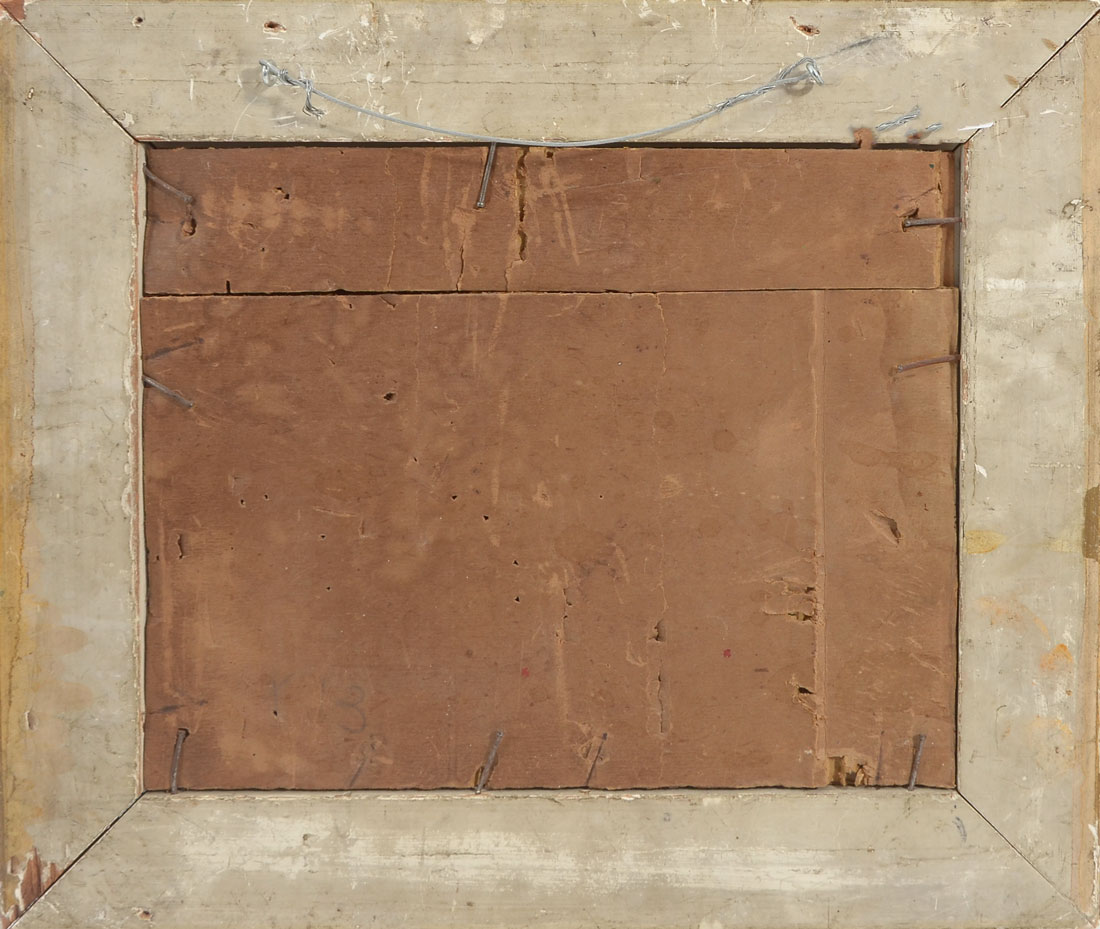 CONDITION: Unstretched, needs cleaning, several minor flecks, frame shows ware and loss, sold as is.