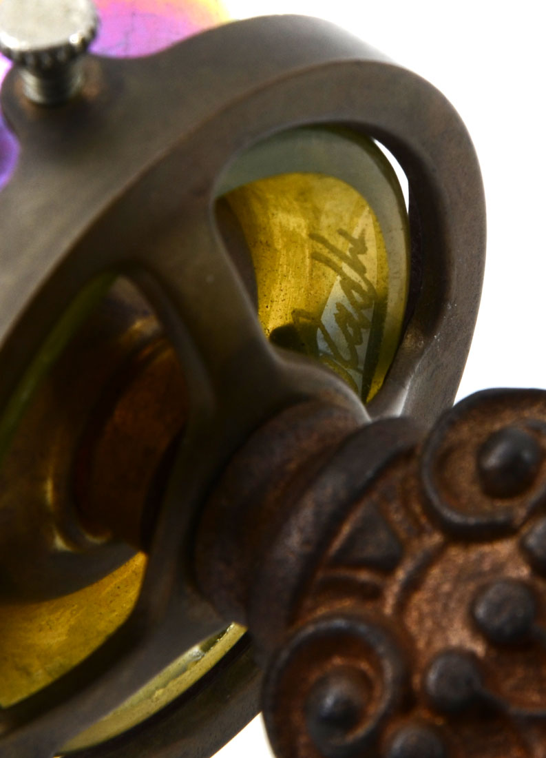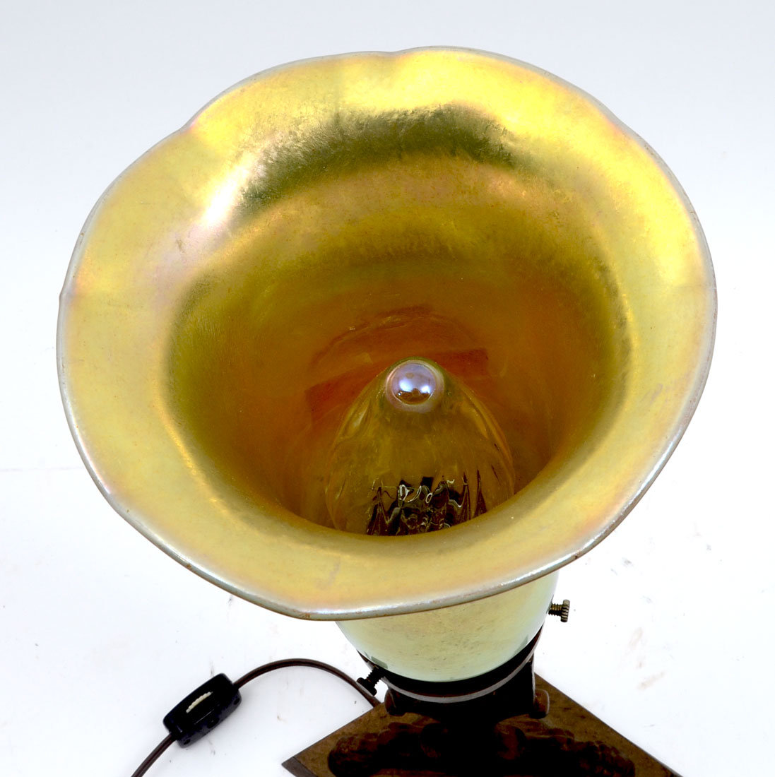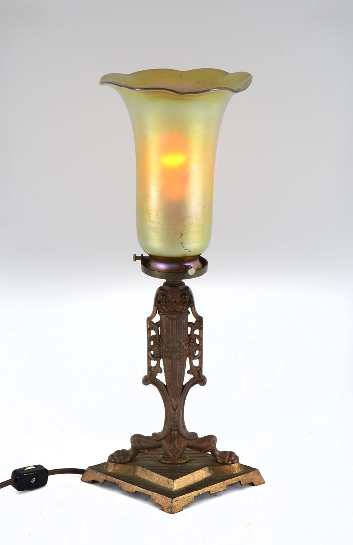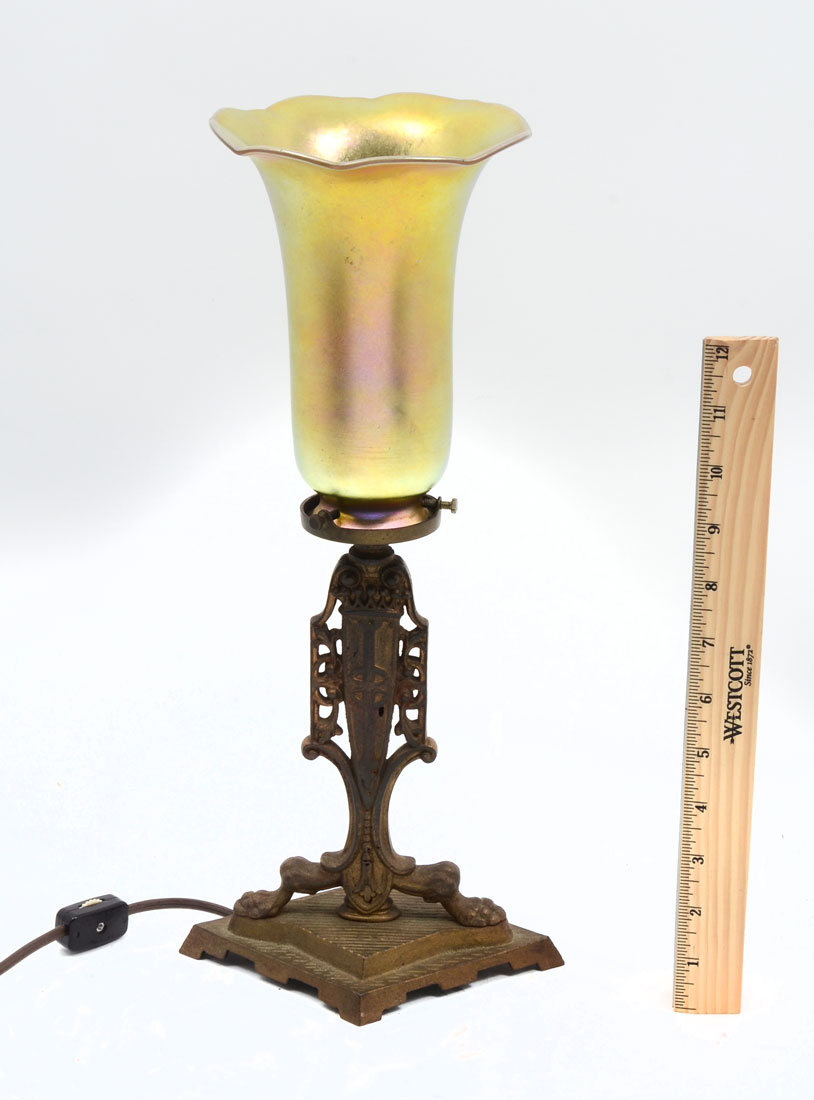 CARL RADKE SIGNED IRIDESCENT ART GLASS LAMP: This Carl Radke Iridescent Lamp is signed on the inner bottom lip of the glass shade. The shade is Iridescent lime green with iridescent purple accenting at top flared rim and bottom rim. Resting on an art nouveau style brass base decorated with a crown, shield, and scrolling surrounding design. Attached to base at the 2 lions paws. Approx. 15.25'' h x 7'' l x 5.25'' w.