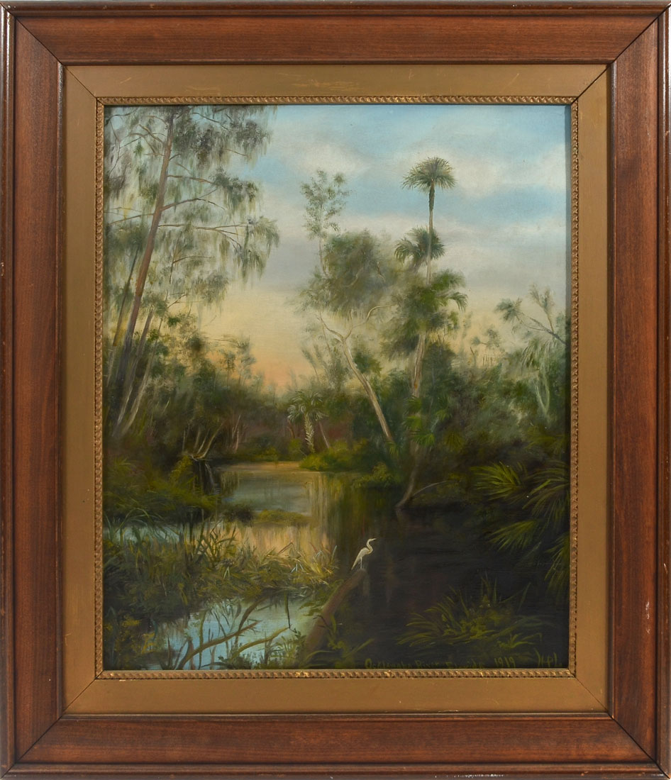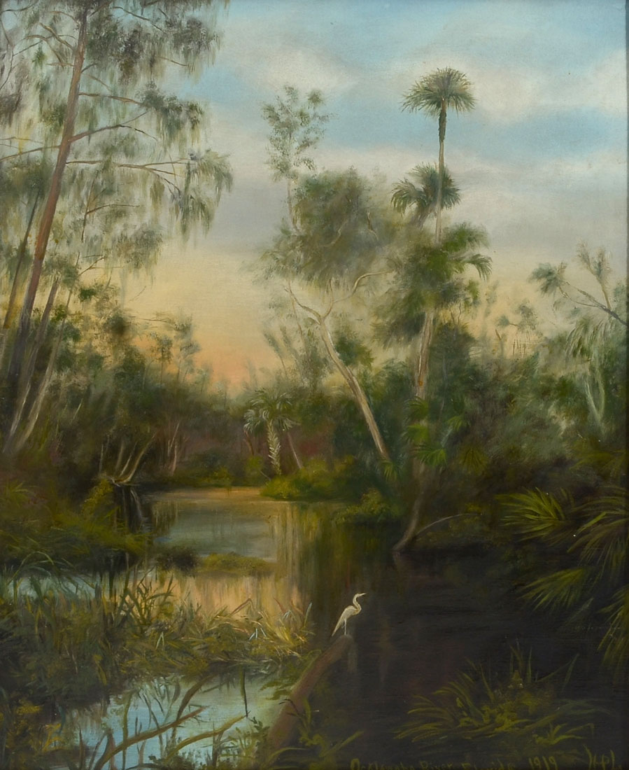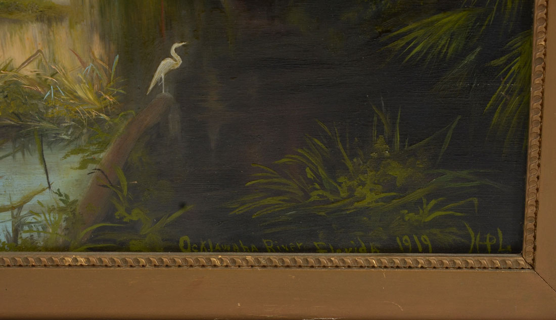 EARLY FLORIDA RIVER PAINTING 1919: ''Ocklawaha River, Florida 1919'', Oil/Board, sight size is 18.50'' x 15.50'', signed lower right and monogramed H. P. L.?, framed 24.50'' x 21.50''.
