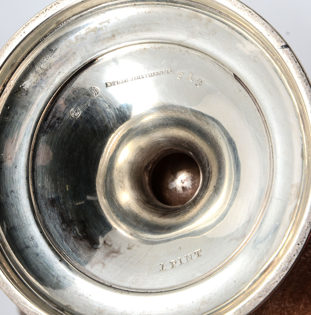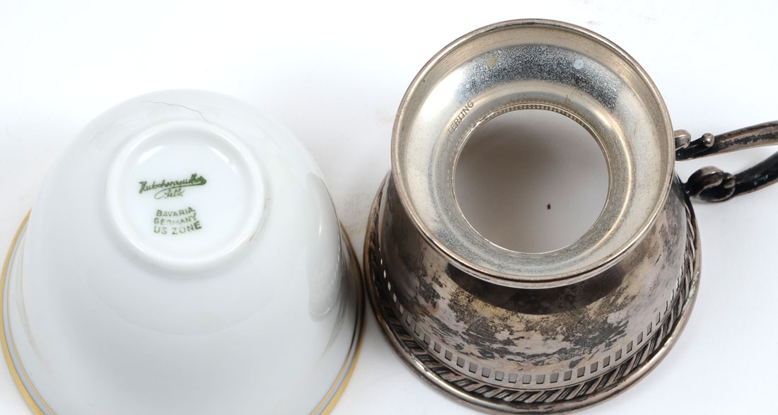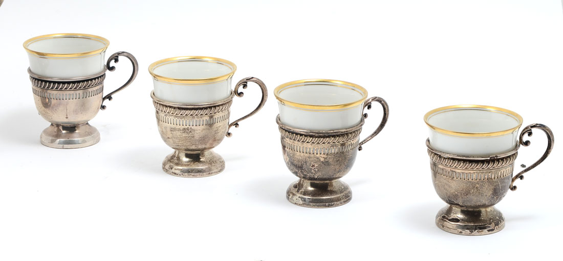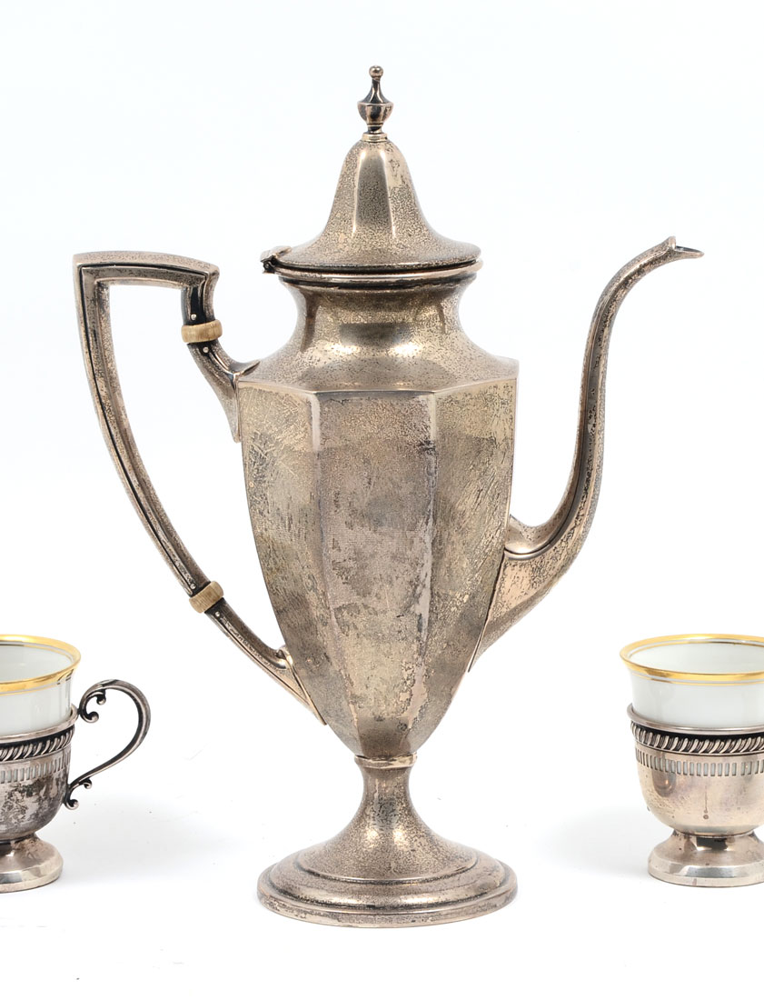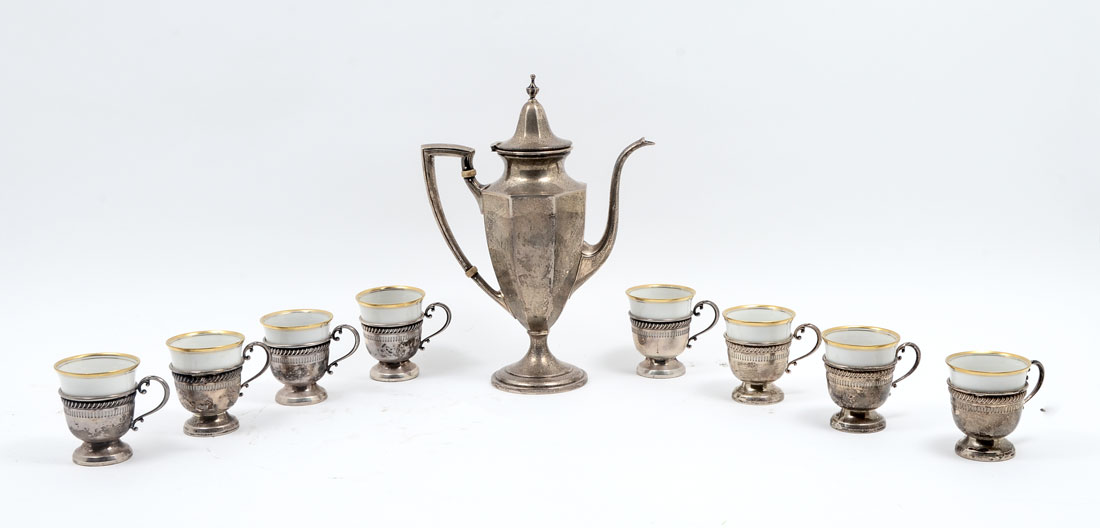 9 PIECE STERLING POT WITH 8 HUTSCHENREUTHER SELB L.H.S. PORCELAIN CUPS IN STERLING: Comprising a 19th century paneled Teapot with 2 accenting bands on handle, 8 German Hutschenreuther Selb L.H.S. porcelain cups in Sterling Silver handled holders. Teapot Approx. 10.5A'' h x 8A'' l x 3.5A'' w. Cups Approx. Cups Approx. 2.75A'' h x 3A'' l x 2.25 w (Approx. 21.13 Troy ounces)
