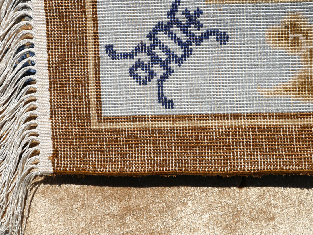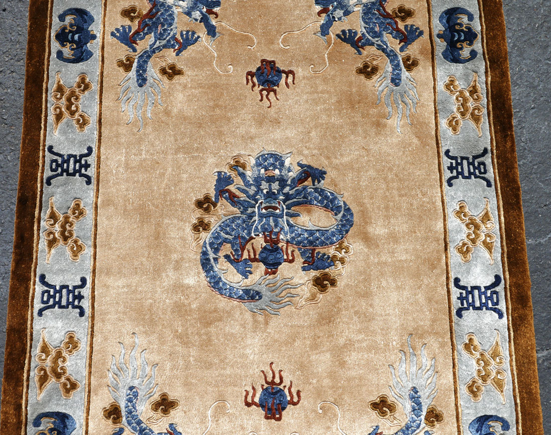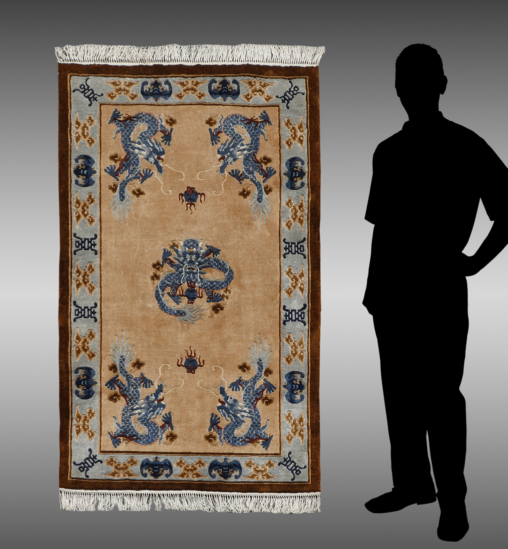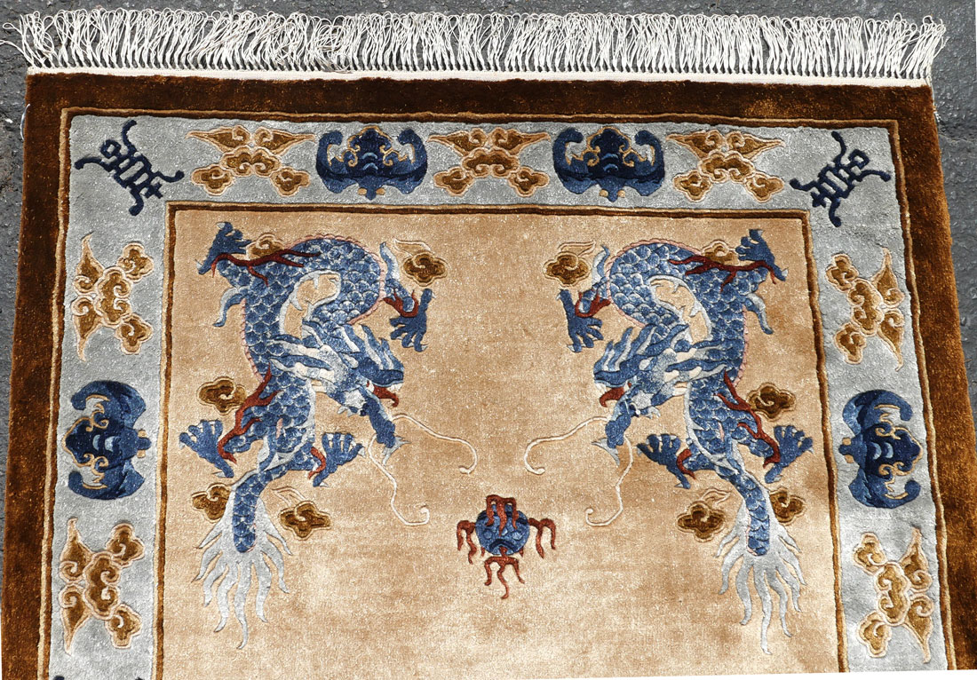CHINESE HAND KNOTTED SILK RUG, 3' X 5'1'': Five Dragons in shades of blue are on a pale beige field chasing flaming pearls.