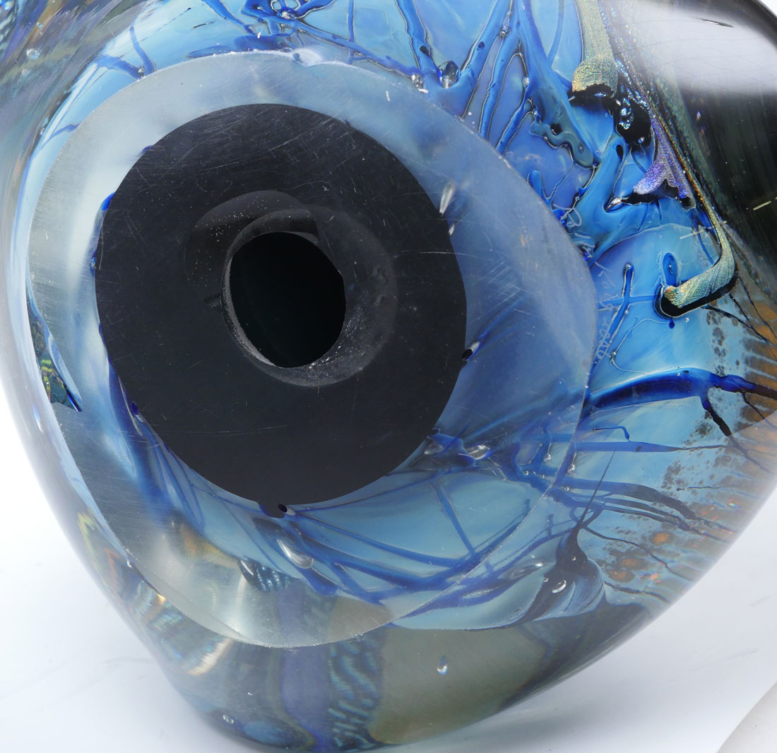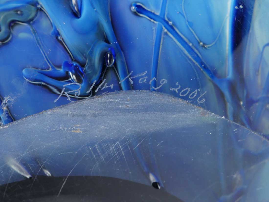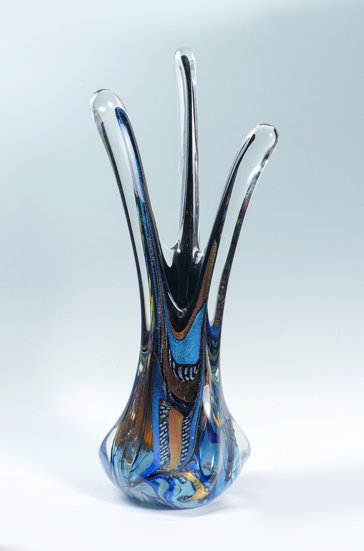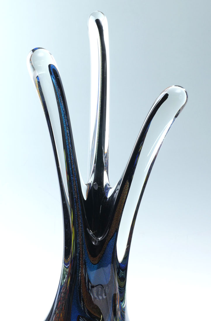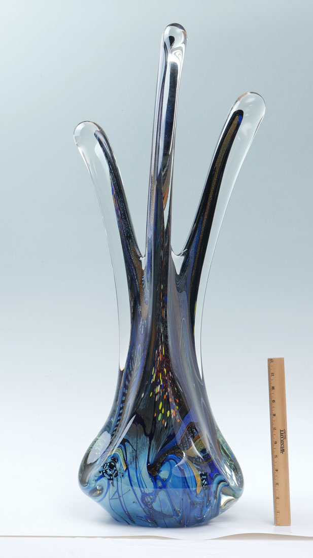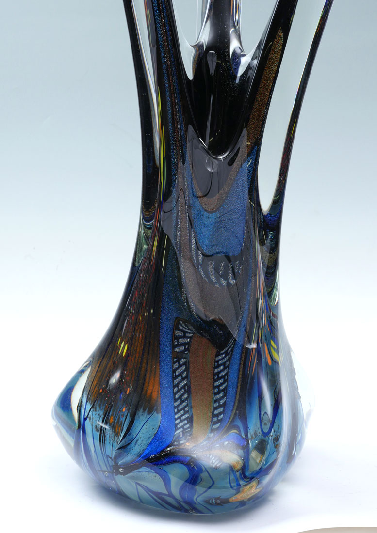 LARGE KARG SIGNED DICHROIC ART GLASS SCULPTURE: Large 3 peaked Dichroic in clear art glass sculpture signed Rollin Karg 2006. Approx. 35.875'' h x 14'' l x 12'' w.