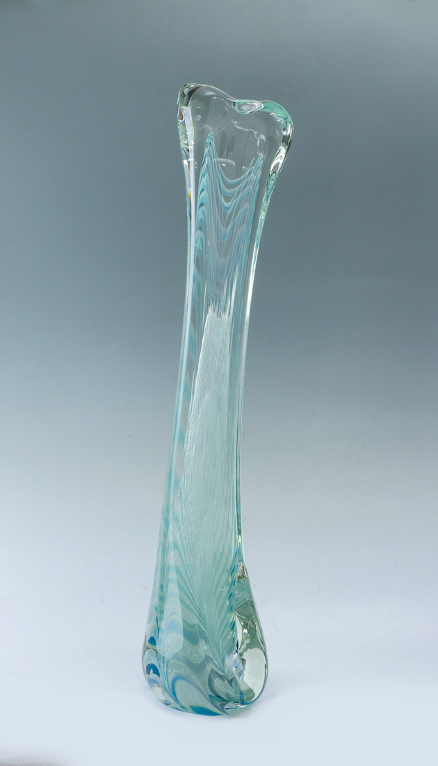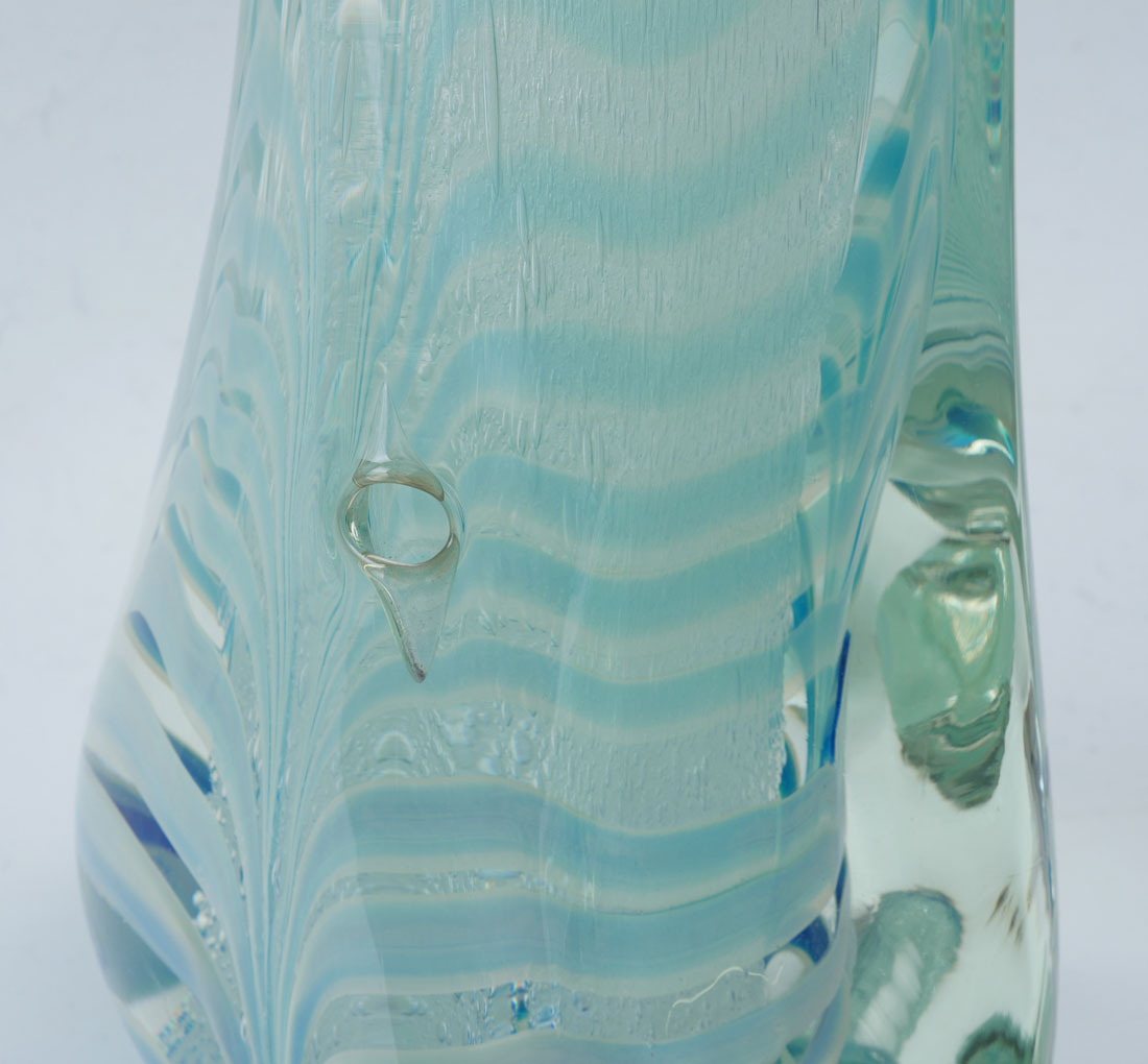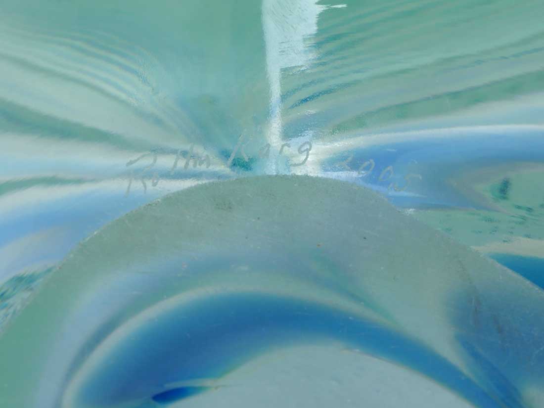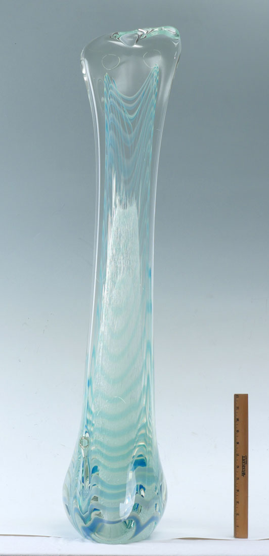 LARGE KARG SIGNED IRIDESCENT ART GLASS: Large pulled iridescent seafoam in clear art glass sculpture signed Rollin Karg 2005. Approx. 44'' h x 11'' l x 9'' w.