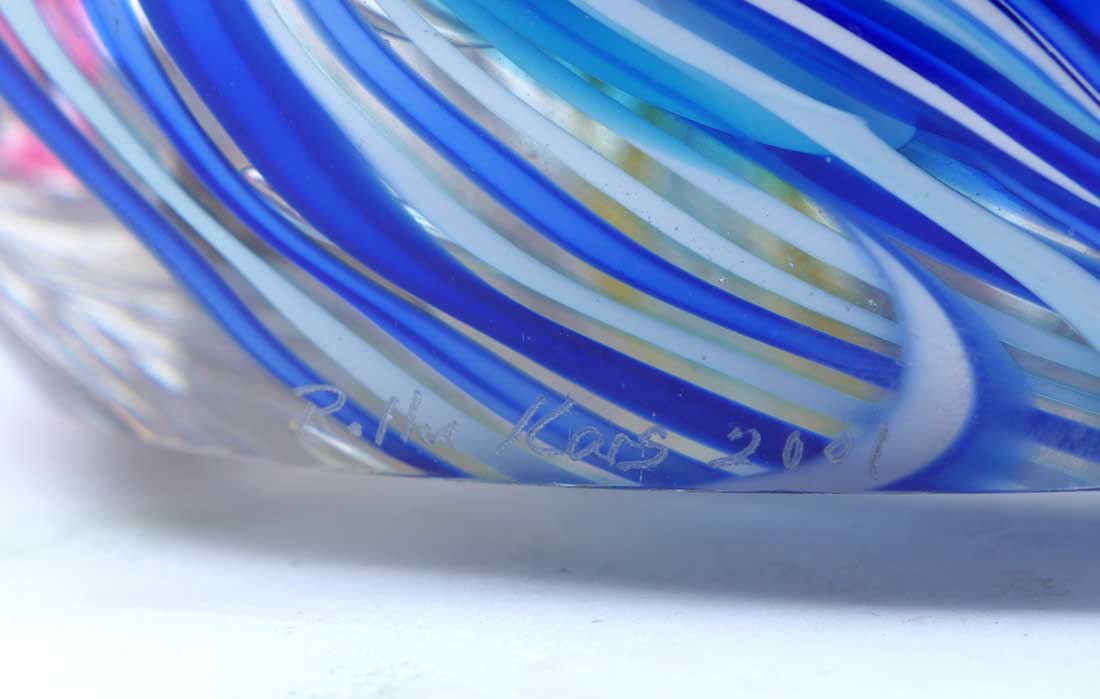 KARG SIGNED MULTI-COLORED ART GLASS SCULPTURE: Ovoid multi-colored stylized floral form art glass sculpture signed Rollin Karg 2007. Approx. 23.25'' h x 11.125'' l x 8.125'' w.