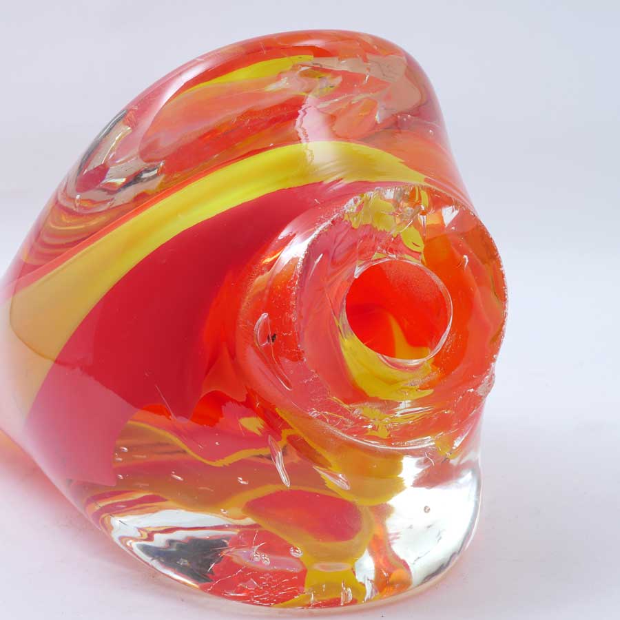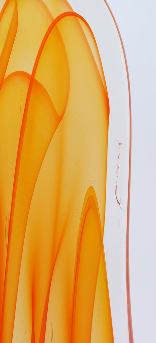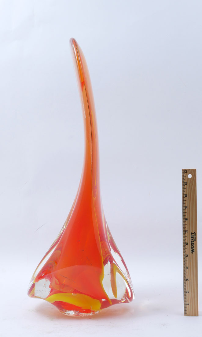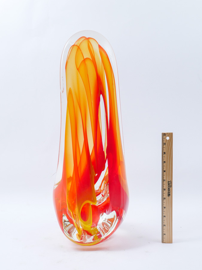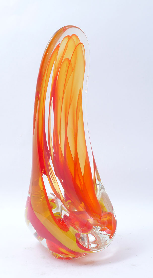 VIBRANT KARG ART GLASS SCULPTURE: Orange to red and yellow in clear art glass sculpture with Dichroic accenting throughout. Approx. 23.875'' h x 9.25'' l x 9'' w.