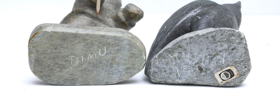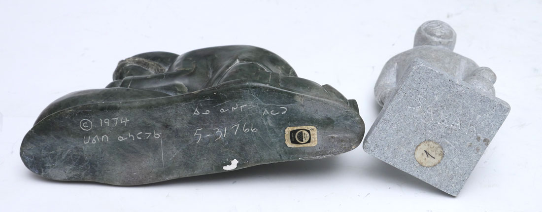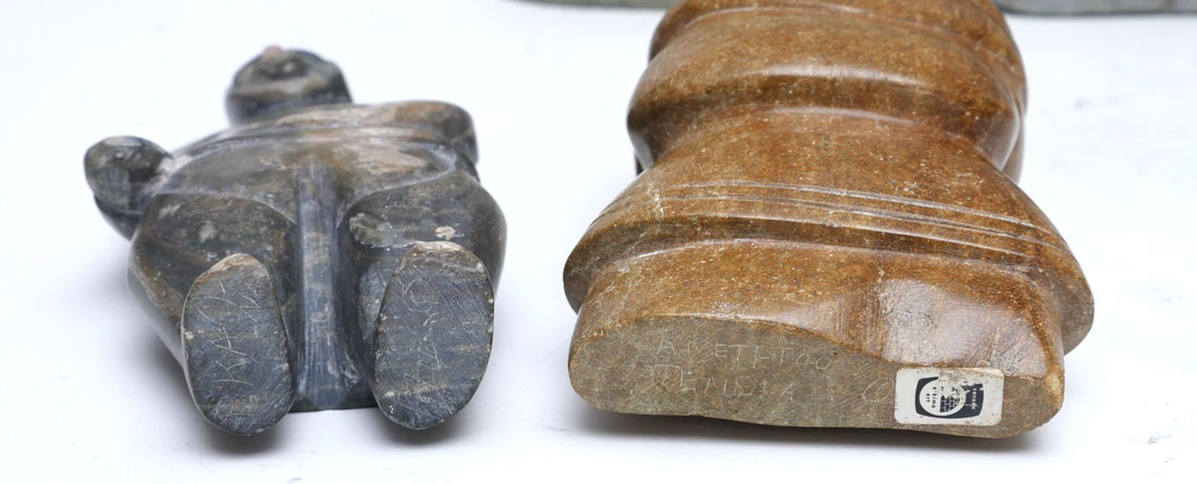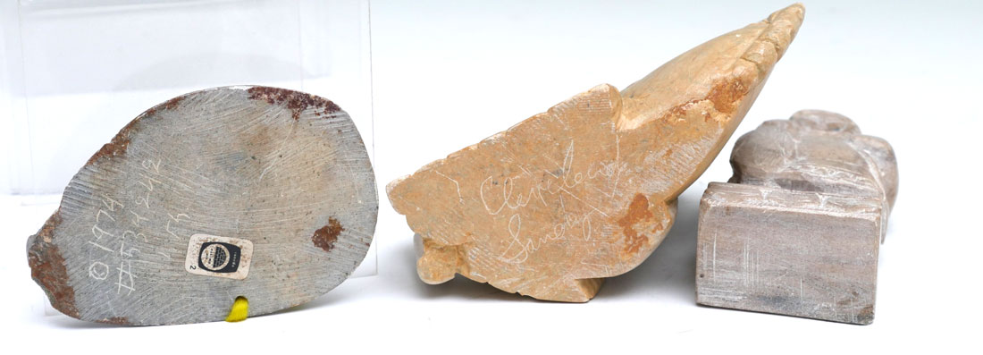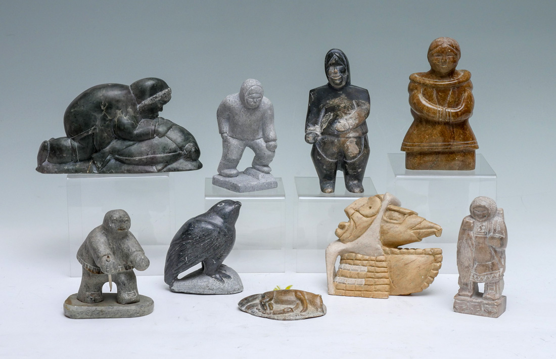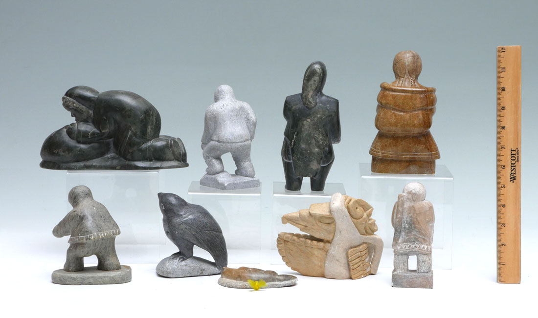 9 INUIT / CANADIAN SOAPSTONE & SERPENTINE CARVINGS: An assembled collection of 9 Canadian and Inuit stone carvings, signed piece to include Sarak, Dimu (Dietrich Muchenheim), Anetetoo Temela, Cleveland Sanely, and Maina? 4 pieces with original Canada Eskimo Art labels. Largest piece measures 4 1/2'' h. x 8 1/2'' x 2 1/2''.