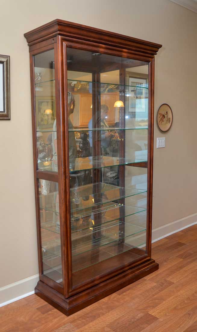PHILIP REINISCH GLASS DISPLAY CURIO CABINET: Molded cornice, sliding front door, illuminated mirrored back interior with 6 glass shelves. 80 1/4'' h. x 43 1/2'' x 16 1/2''.