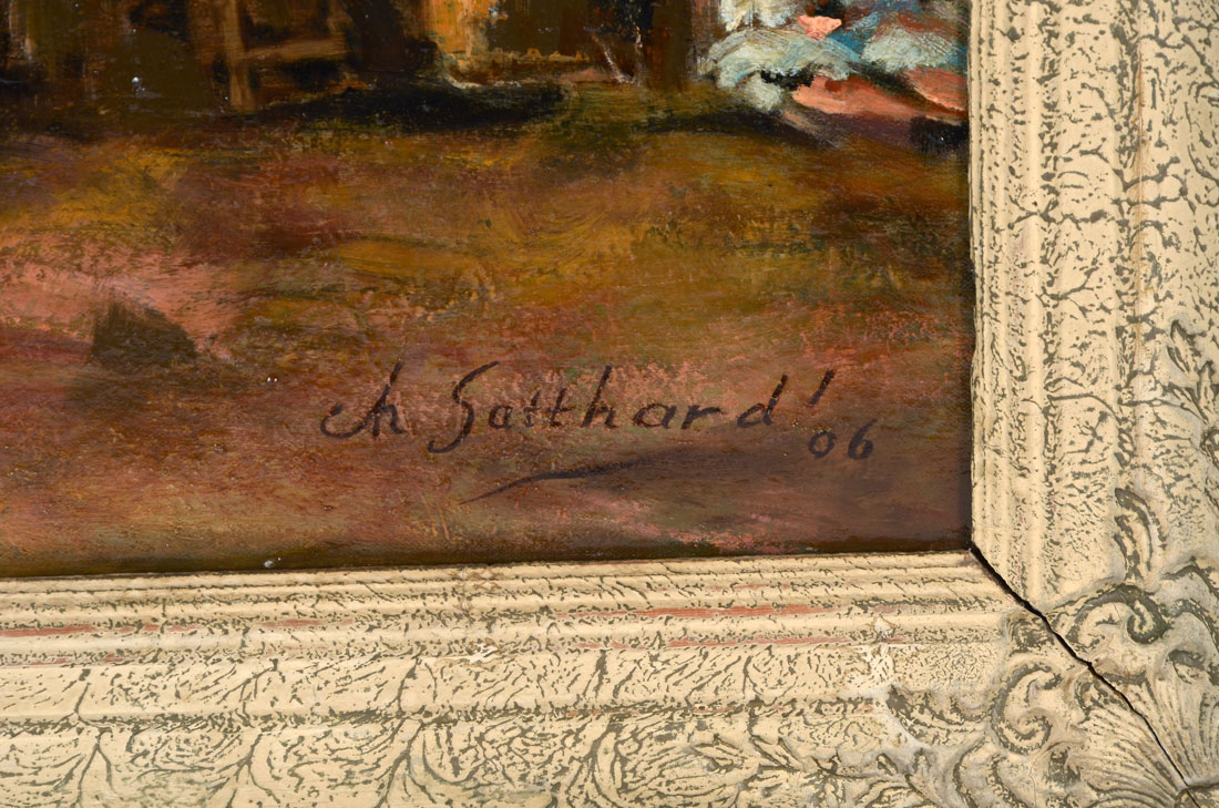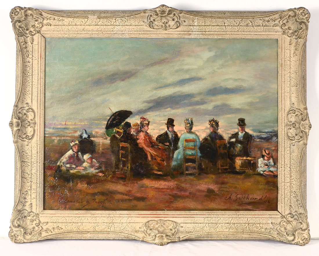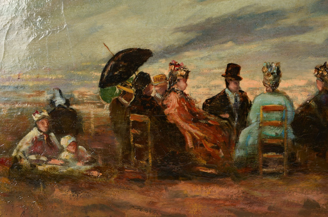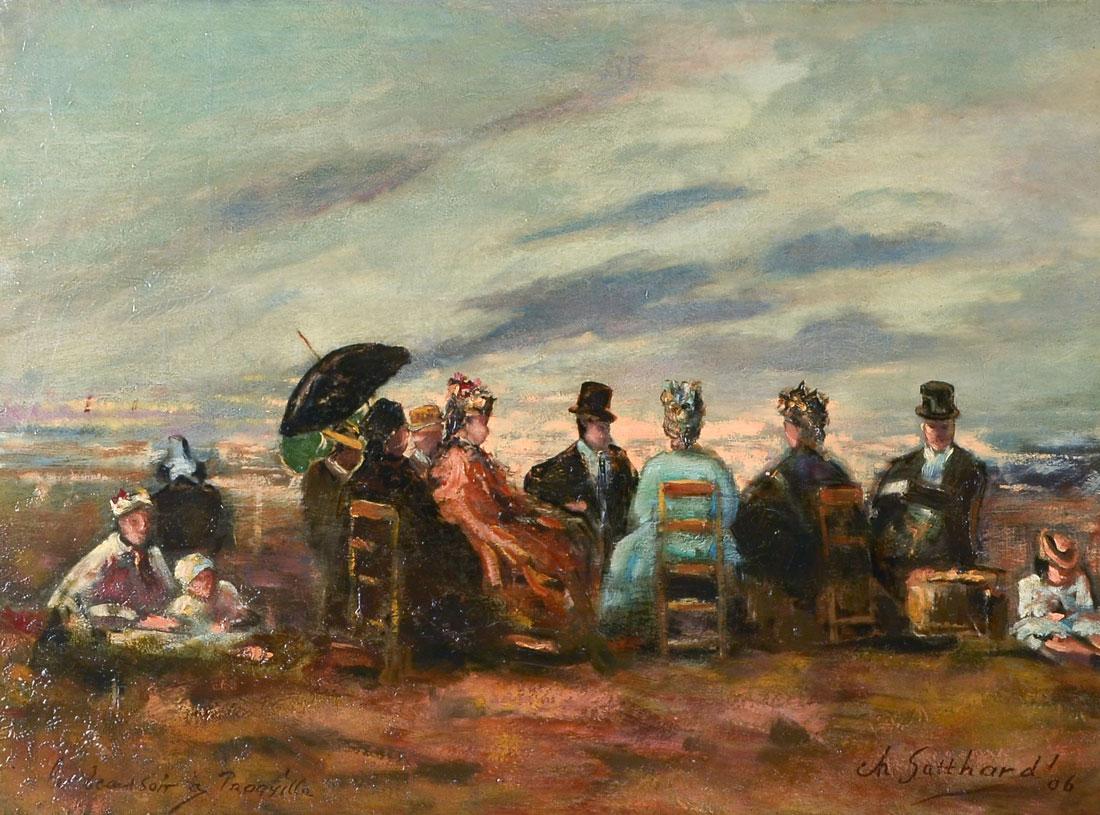 TROUVILLE BEACH SCENE PAINTING AFTER BOUDIN: ''La Beaux Soir a Trouville'', Depicts Figures Fancily Dressed Gathered on a Beach, Oil/Canvas, sight size is 23.50'' x 31.50'', signed lower right ''Satthard'' and dated 06', carved and painted frame measures 31'' x 39'', titled lower left.