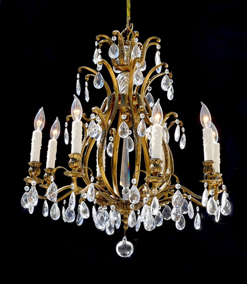 8 LIGHT ART NOUVEAU BRASS AND CRYSTAL CHANDELIER: Brass scrolling foliate frame and arms adorned with multi-faceted teardrop crystals, and 1 round crystal in center. Approx. 30'' h x 27'' w.