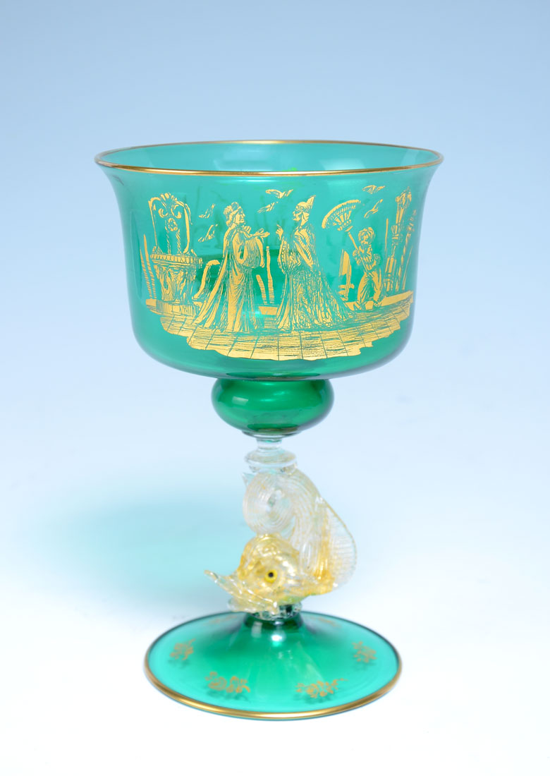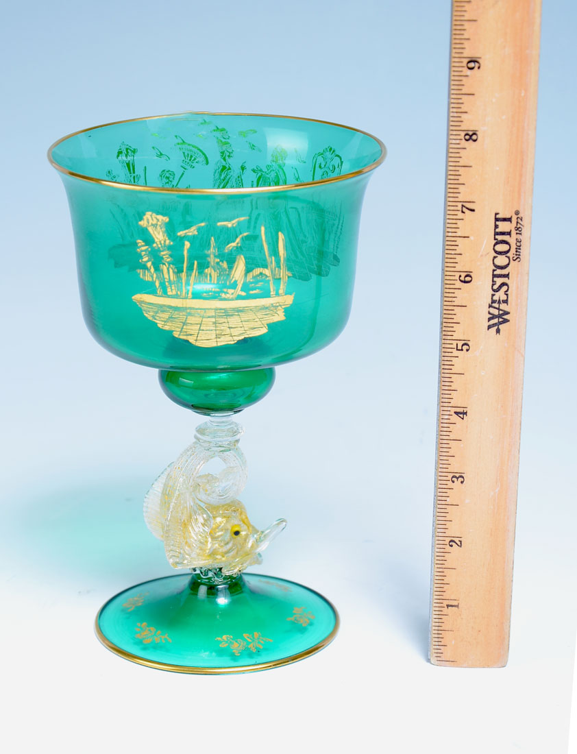 FIGURAL DOLPHIN STEM VENETIAN GLASS GOBLET: Green glass cup and foot, top cup with applied gilt Venetian outdoor genre scene, aventurine clear glass figural dolphin stem, foot with gilt floral decoration. Overall 7 3/4'' h. x 5''.