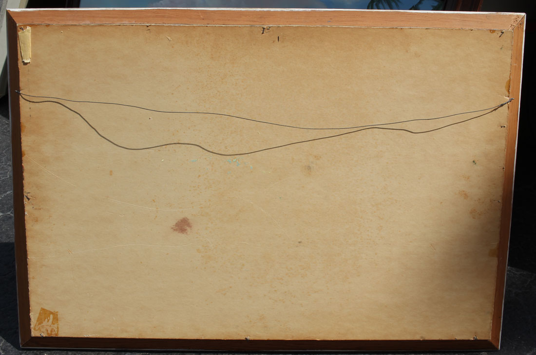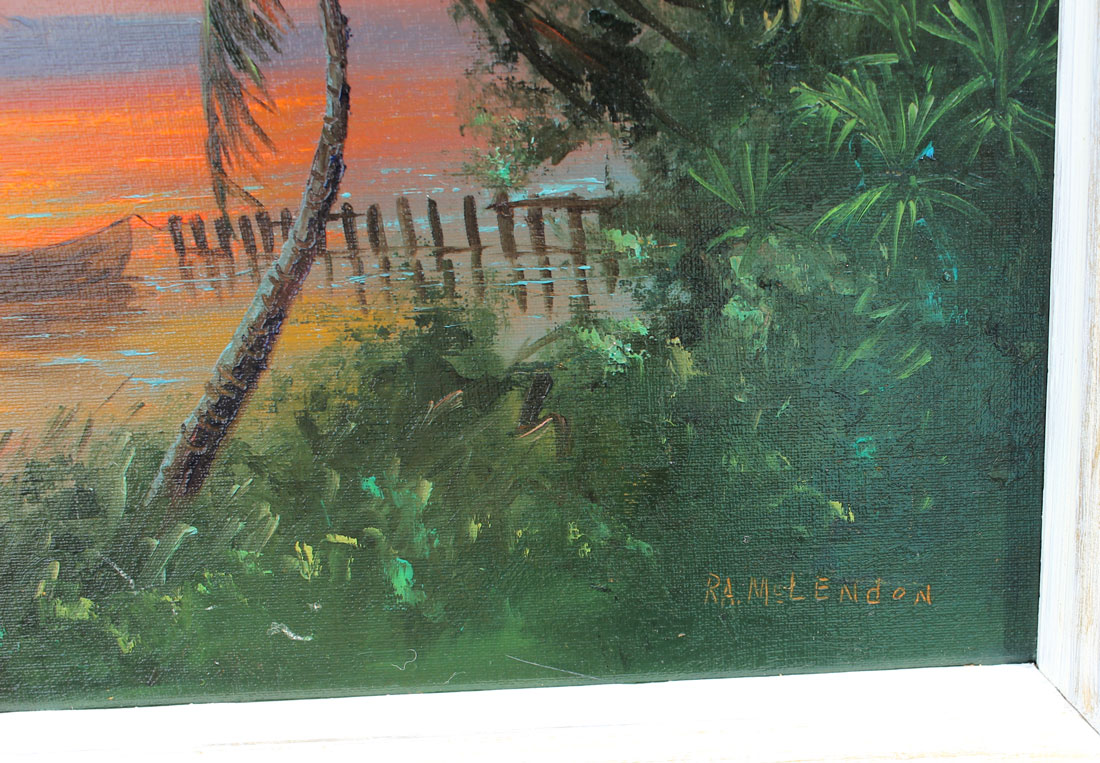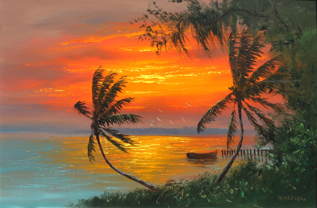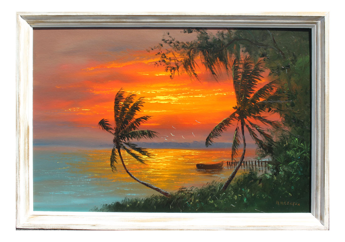 MCCLENDON, Roy A., (American, 20th century): Florida Highwaymen Fire Sky on the Indian River scene with palm tree, boat and relic dock, Oil/Upson, signed lower right, 24'' x 36'', framed 27'' x 39''.
