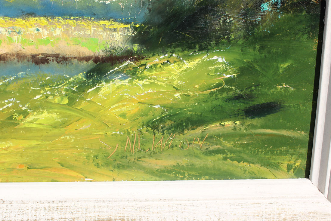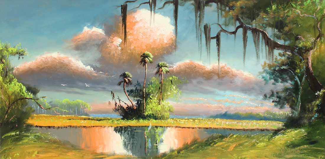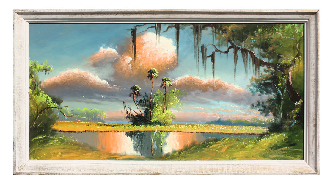 NEWTON, Sam, (American, 20th Century): Florida Highwaymen St. Johns River backwaters scene with pink clouds and stand of trees, Oil/Upson, signed lower right 24'' x 48'', framed 27 1/2'' x 51 1/4''.