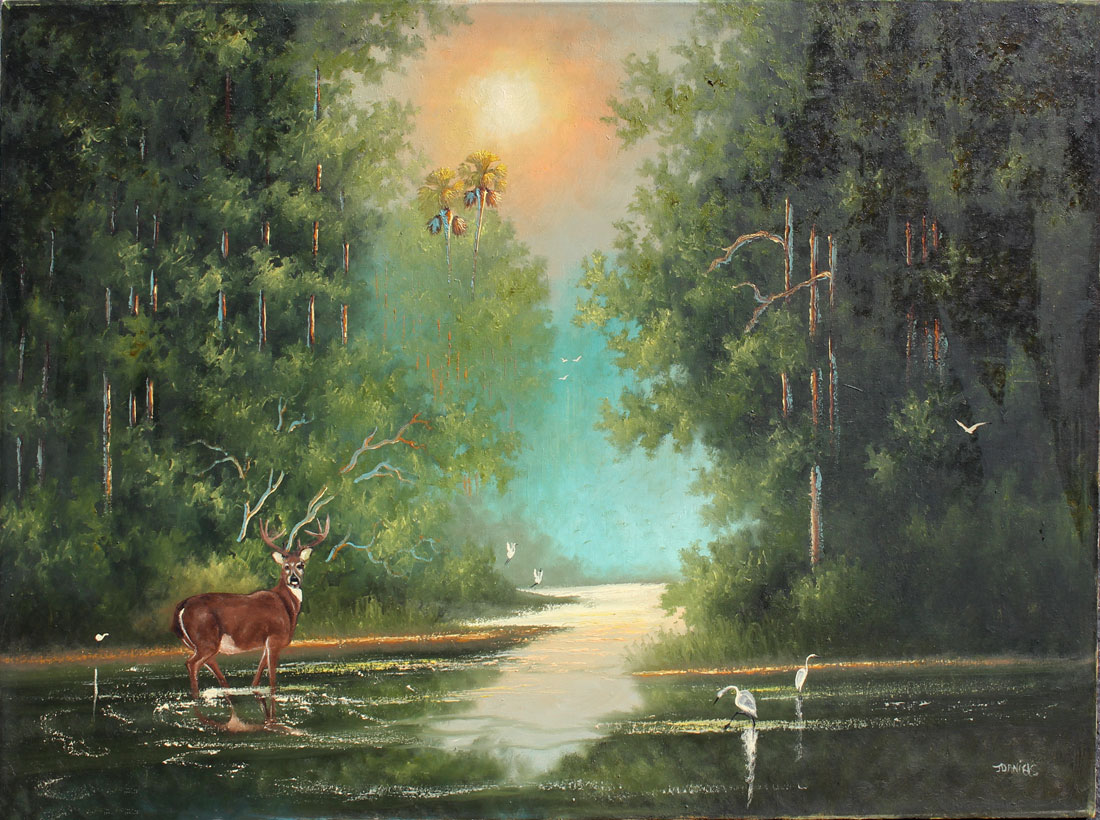 DANIELS, Johnny, (American, 1954-2009): Florida Highwaymen St. Lucie River scene with deer and birds, Oil/Canvas, signed lower right, 30'' x 40'', framed 37 1/2'' x 47 1/2''.