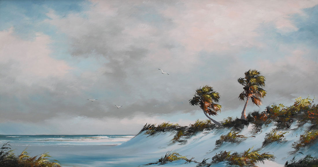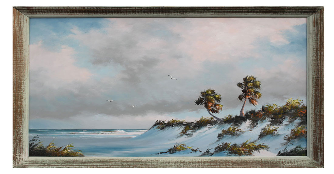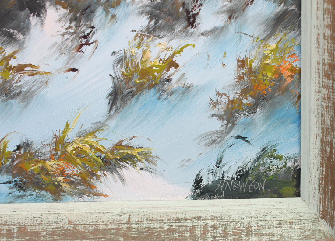 NEWTON, Harold, (American, 1934-1994): Florida Highwaymen Rio Mar coastal scene with palm trees and birds, Oil/Masonite, signed lower right, 26'' x 36'', framed 29 1/2'' x 39 1/2''.
