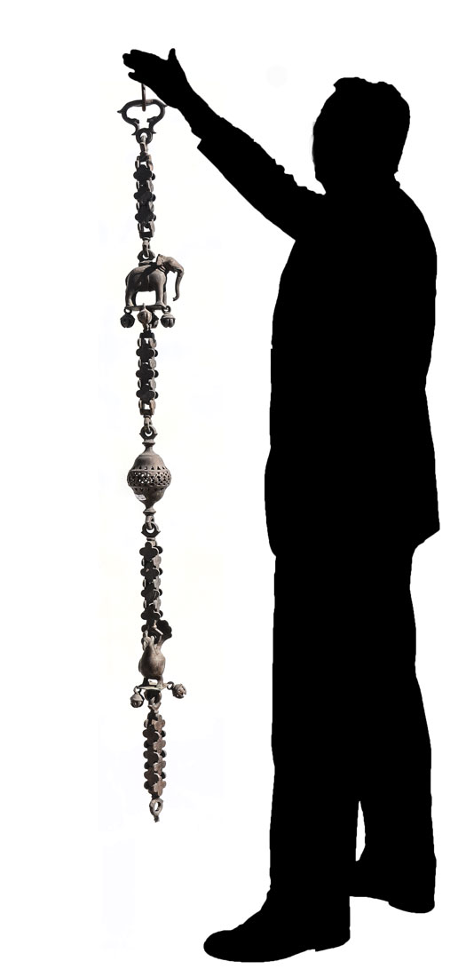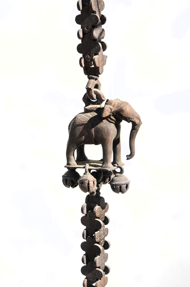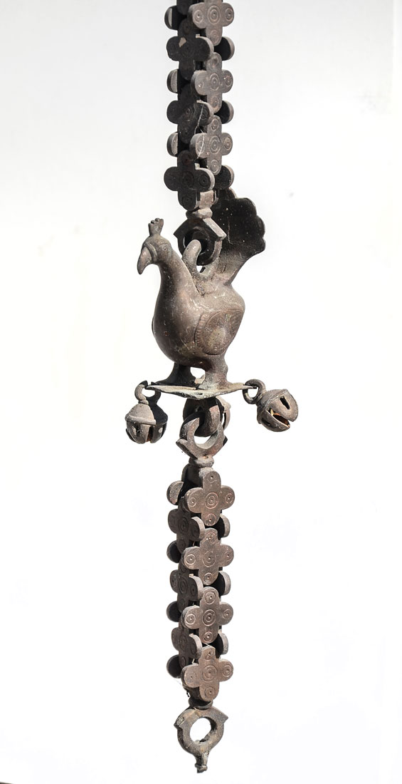 CAST BRASS TEMPLE FIGURAL GHANTAS CHAIN: Old Middle Eastern cast brass temple/ceremonial chain with an Elephant and Peacock. Elephant and peacock have bells attached at bottom of each. Approx. 53'' h x 5'' w.
