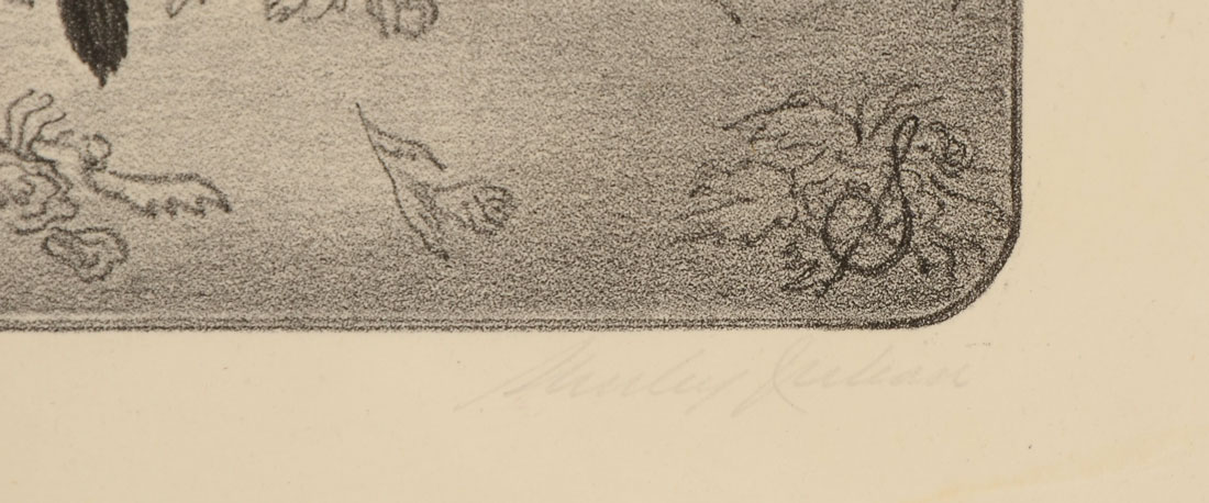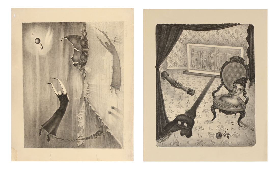 JULIAN, Shirley, (American, 20th C.): 2 Lithographs, ''Difficulty of Thought'', 16'' x 20'', pencil signed/titled, FAP blindstamp, unframed, several tears in left margin and lower, minor spots of foxing; ''Memento'', 18 1/2'' x 15'', pencil signed/titled, FAP blindstamp, unframed, water damage upper right, scattered staining and foxing. Lot sold as is.