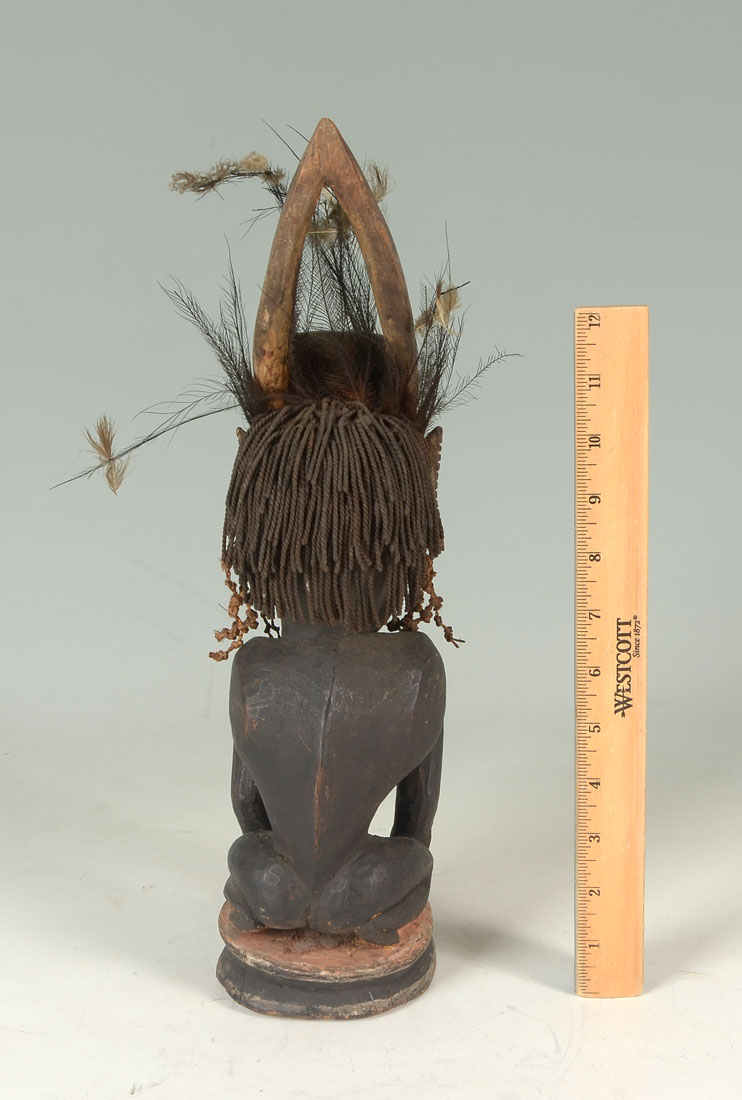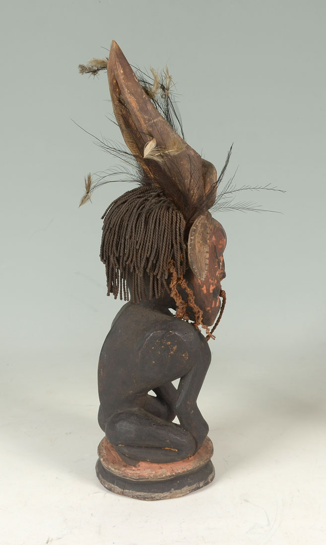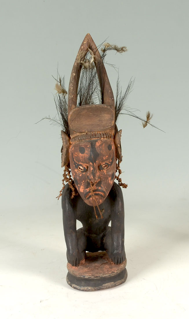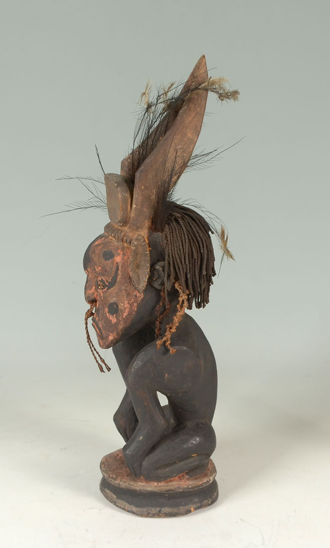 NEW GUINEA CARVED HORNED SPIRIT FIGURE: Kneeling horned figure with feathers and string hair, painted face and top of base, most likely Sepik River, 15 1/4'' x 3 3/4'' x 4 1/2''.