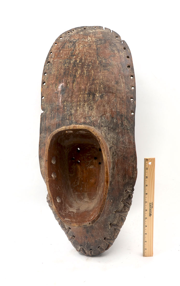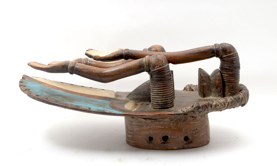 WEST AFRICAN GREBO CARVED MASK: Carved wood and polychrome paint decorated mask with 3 arms reaching up, Grebo culture, Liberia/Ivory Coast, 27 1/2'' h. x 11 1/2'' x 12 1/2''.