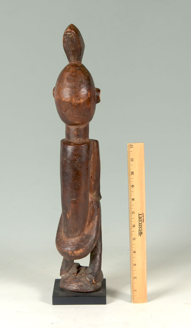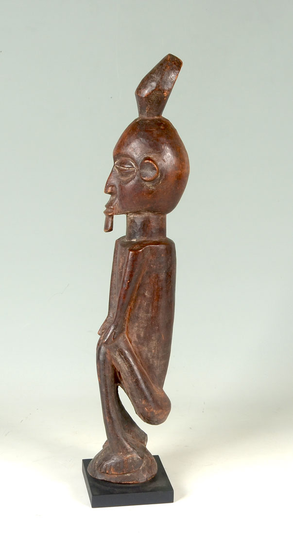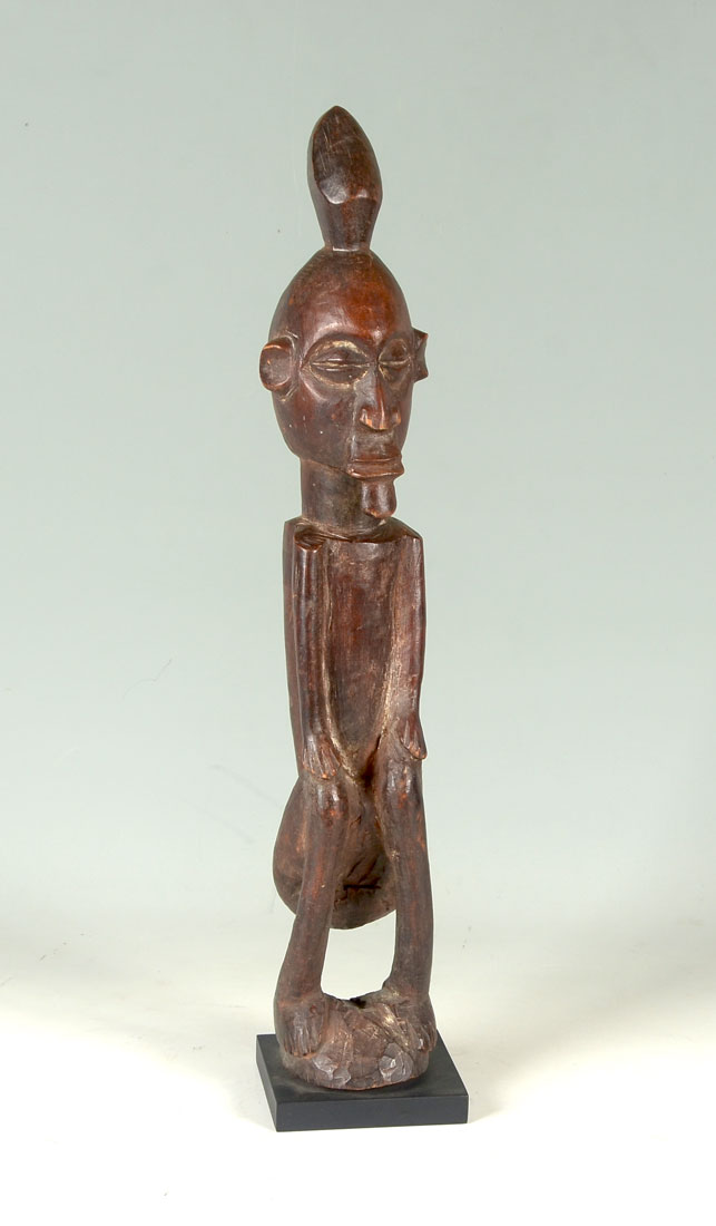 CENTRAL AFRICAN TEKE CARVED POWER FIGURE: Carved wood male figure squatting, affixed to painted wood base, Teke/Bateke culture, Democratic Republic of Congo, 20 3/4'' h. x 4'' x 4''.