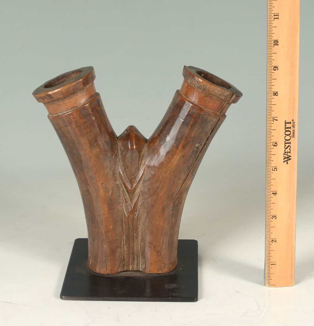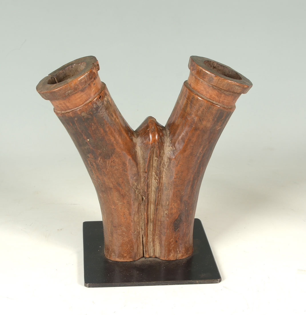 WEST AFRICAN BAMANA CARVED BELLOWS: Double branch carved wood bellows affixed to metal base, Bamana/Bambara culture, Mali/Burkina Faso, 8.5'' h. x 8.5'' x 5.5''.