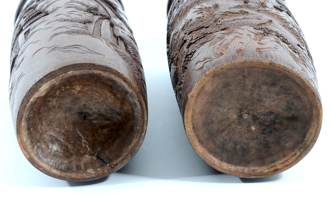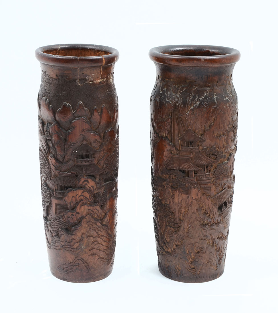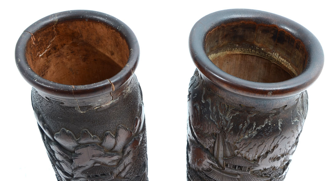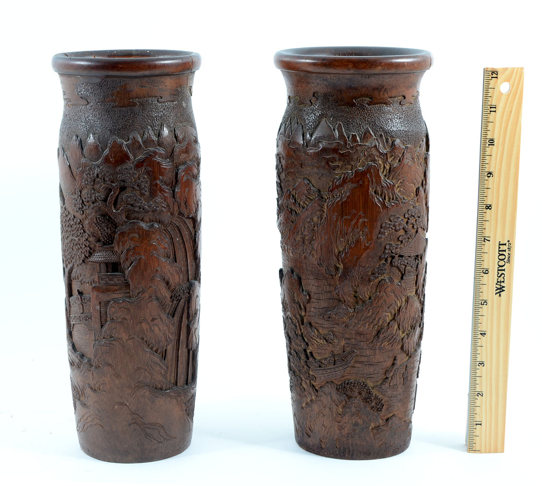 PAIR OF 2 INTRICATELY CARVED BAMBOO VASES/BRUSH POTS: Painstakingly carved bamboo vases/brush pots with elaborate village scenery. The detailing and depth is second to none. Both are Approx. 12.5'' h x 4.5'' l x 4.25'' w.