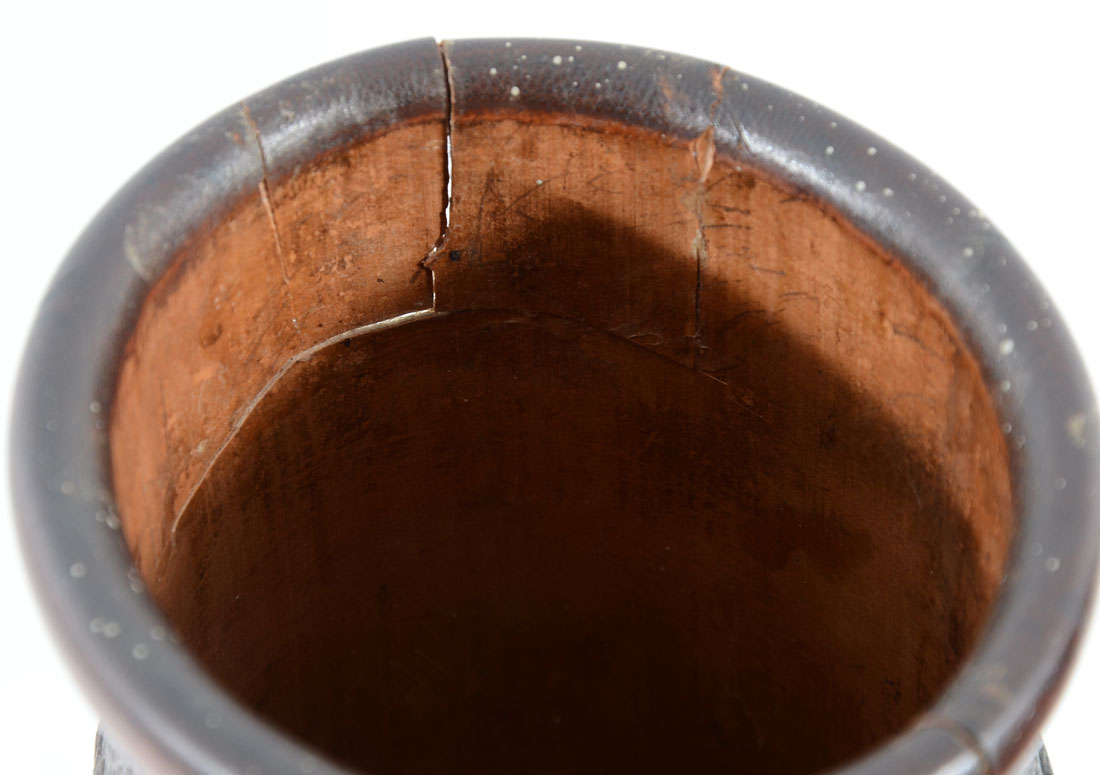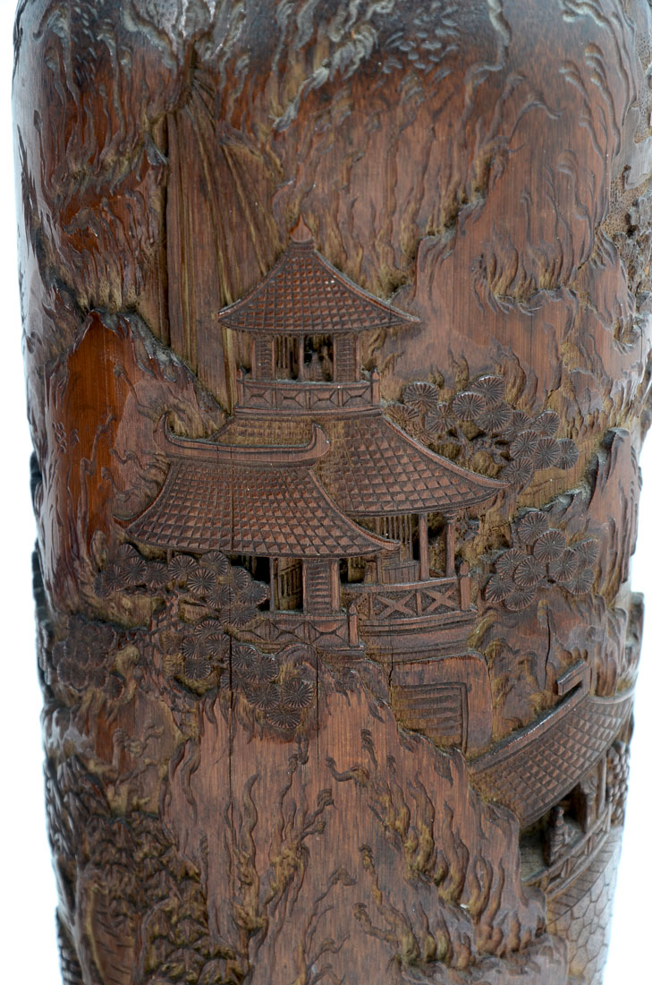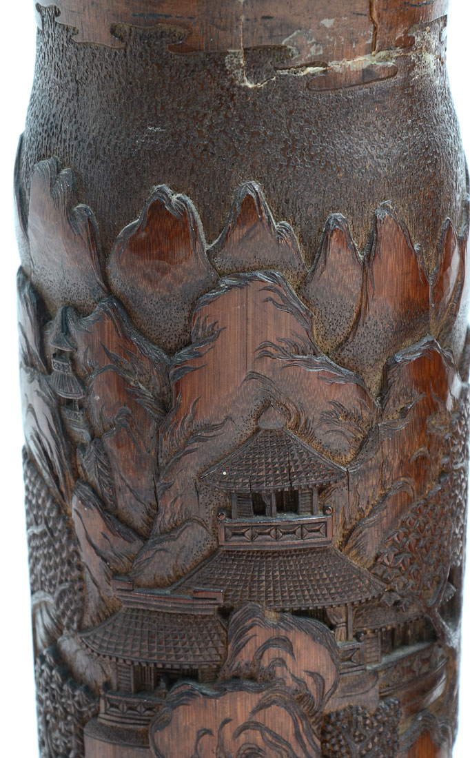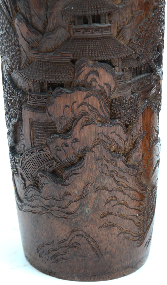 PAIR OF 2 INTRICATELY CARVED BAMBOO VASES/BRUSH POTS: Painstakingly carved bamboo vases/brush pots with elaborate village scenery. The detailing and depth is second to none. Both are Approx. 12.5'' h x 4.5'' l x 4.25'' w.