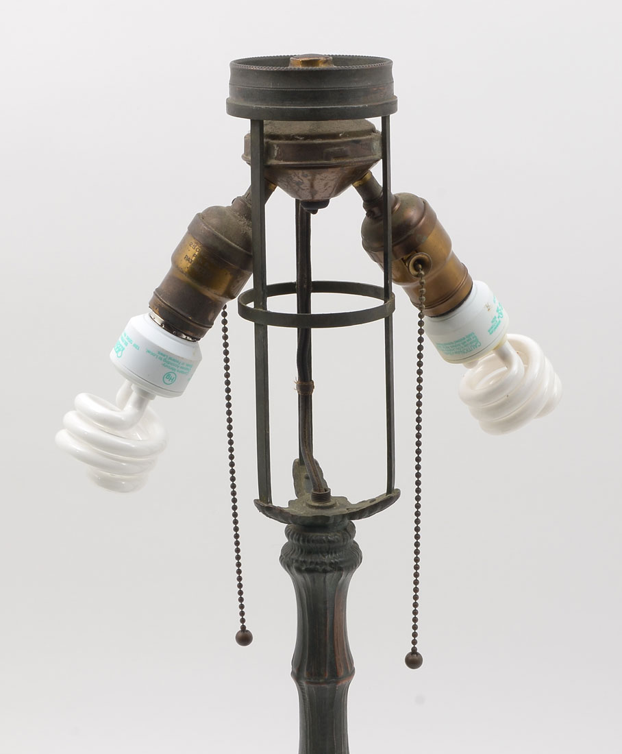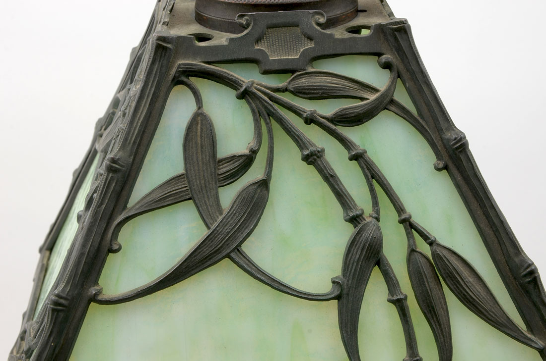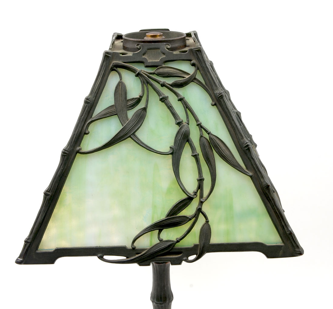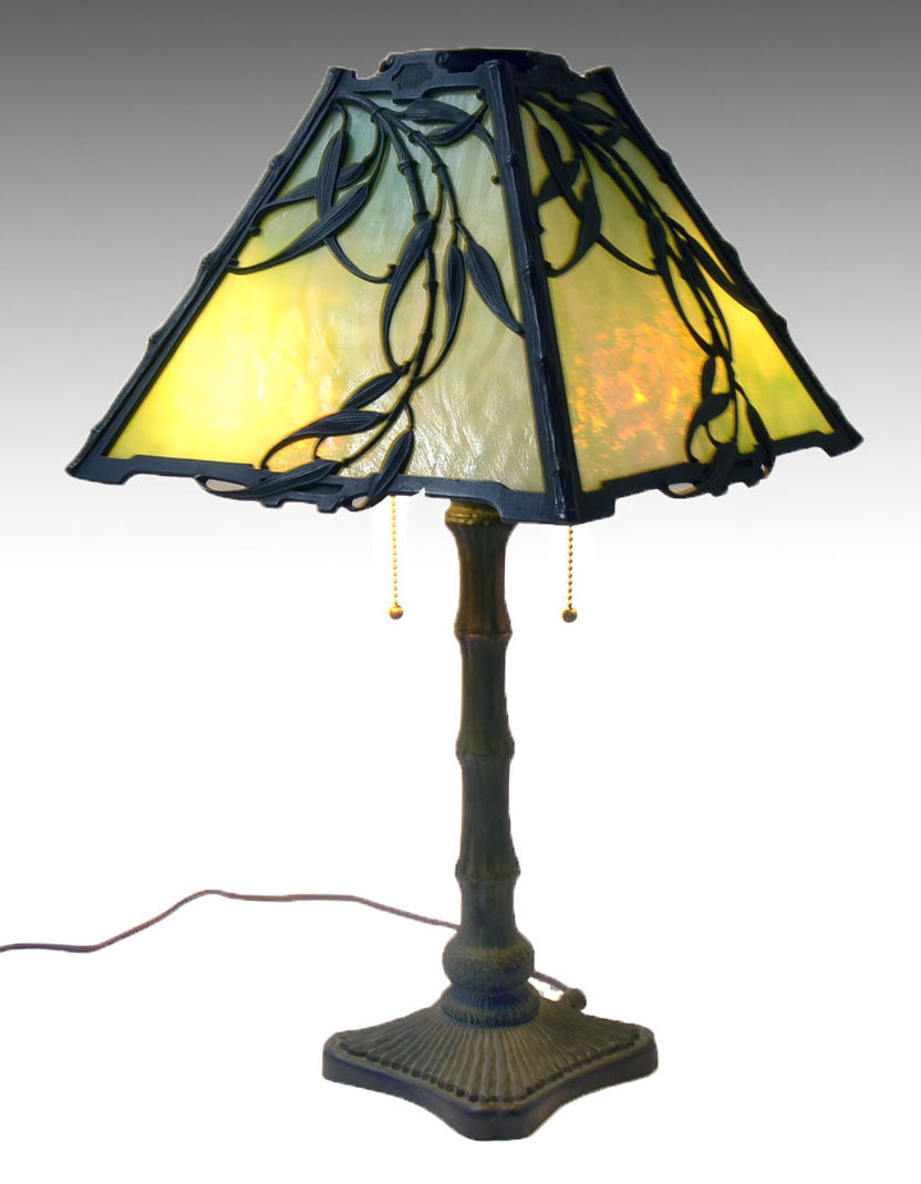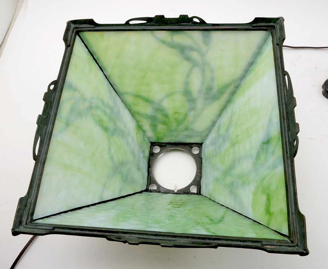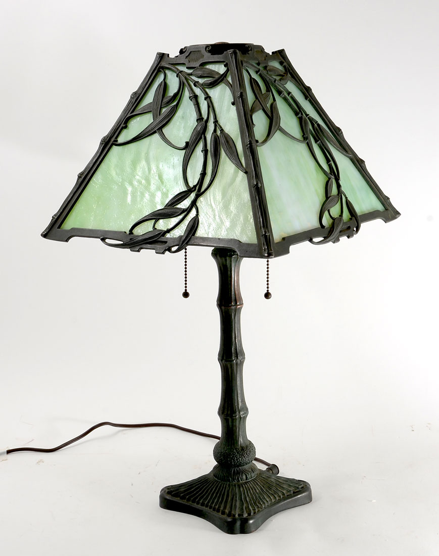 EARLY 20TH PATINATED COPPER SLAG GLASS LAMP: Unique patinated Copper lamp with a Bamboo design and 2 lights. Square 4 paneled green slag glass shade with bamboo motif. Lamp Approx. 22'' h x 12'' w, and base is 7.5'' w.