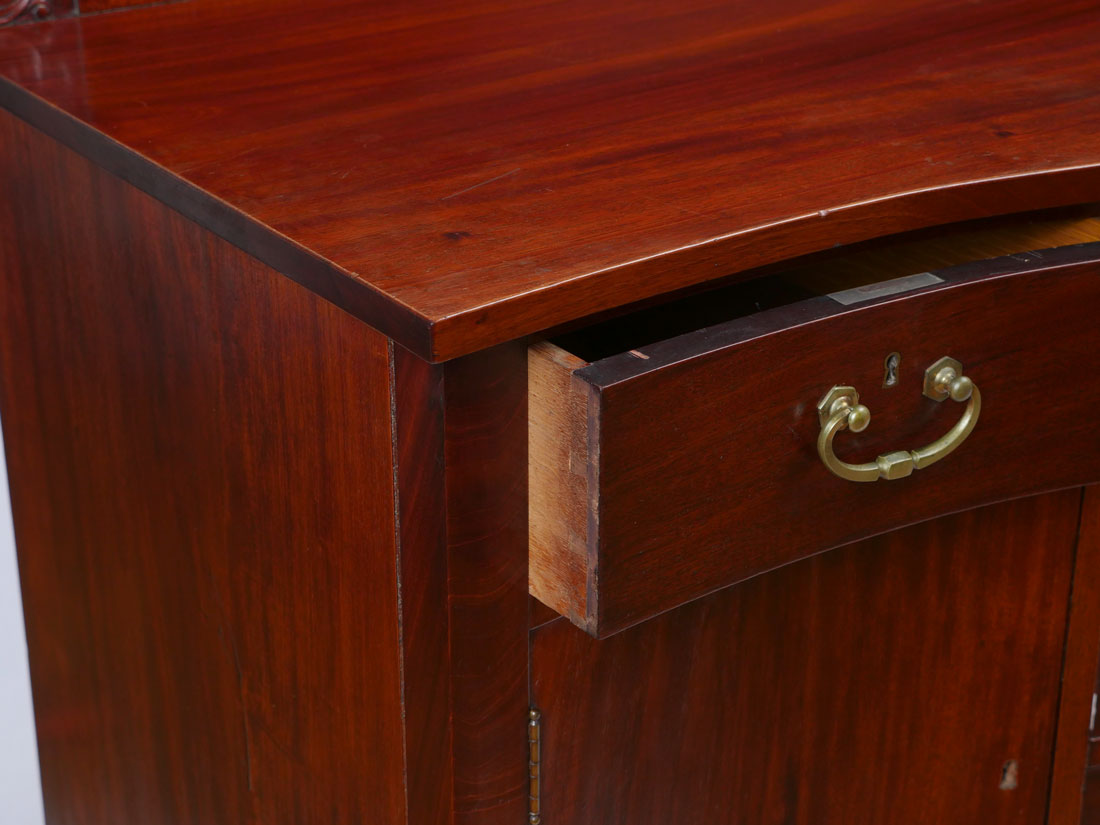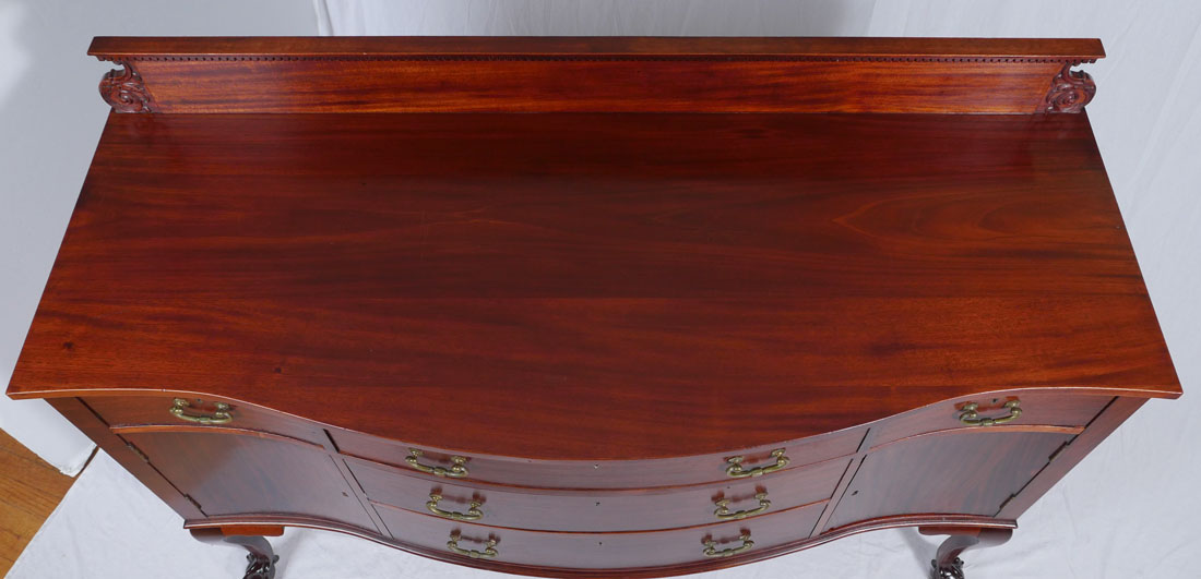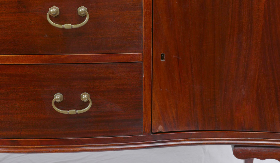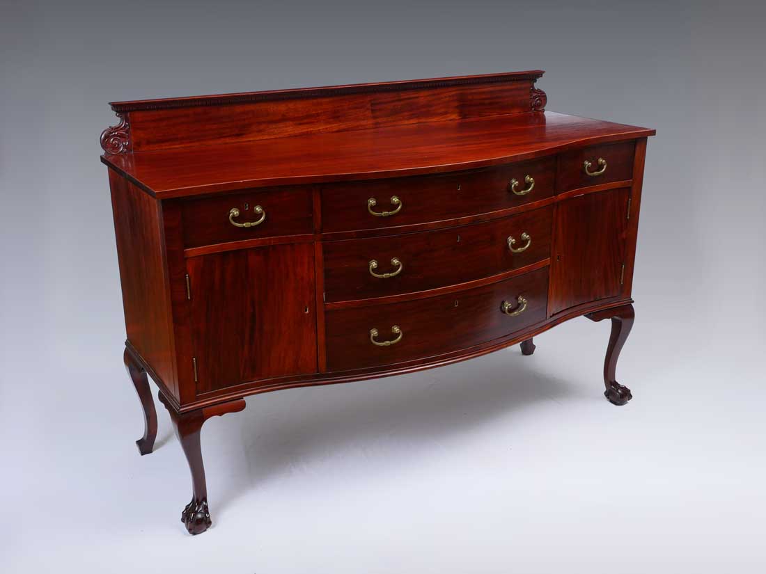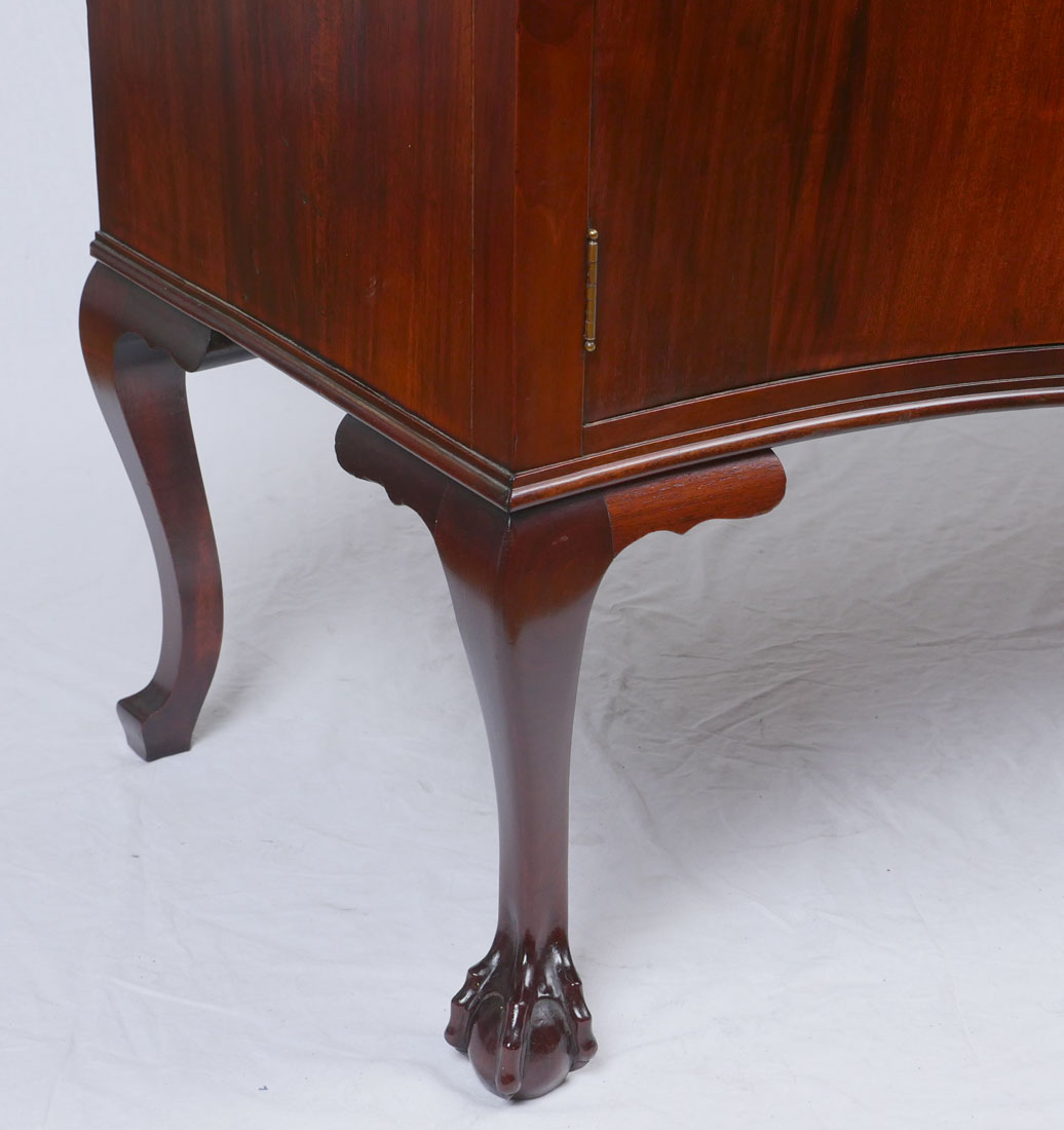 EARLY 20TH CENTURY MAHOGANY BOWFRONT SIDEBOARD: Beautiful Bowfront Mahogany Sideboard with claw on ball front feet. Green velvet lined flatware drawer, key is present. 45'' h x 66'' l x 22'' w.
