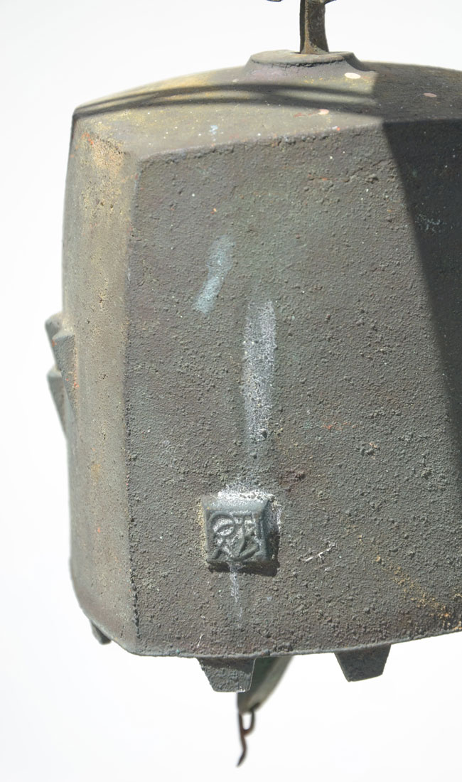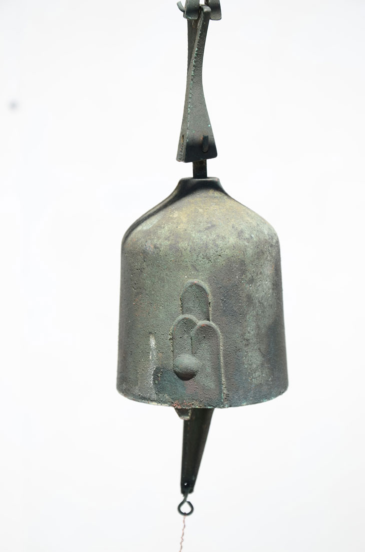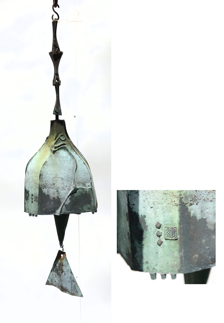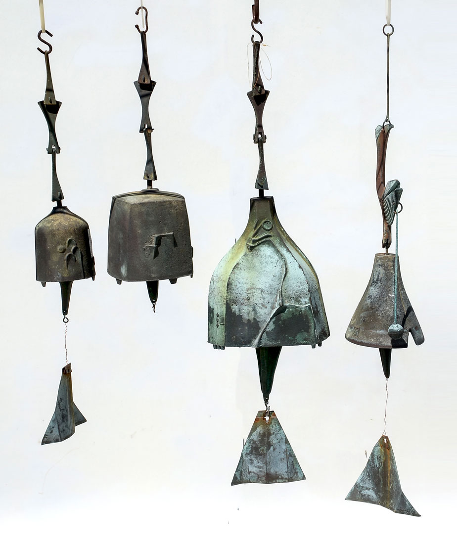 4 PAOLA SOLARI ACROSANTI BRONZE BELLS: 4 cast sand Bronze bells by Paolo Solari Acrosanti (1819-1913), with Copper clappers. A less common ''Save the Whales'' bell. All 4 bare the Solari mark. Largest is Approx. 27.5'' h x 7.5'' l x 7'' w.