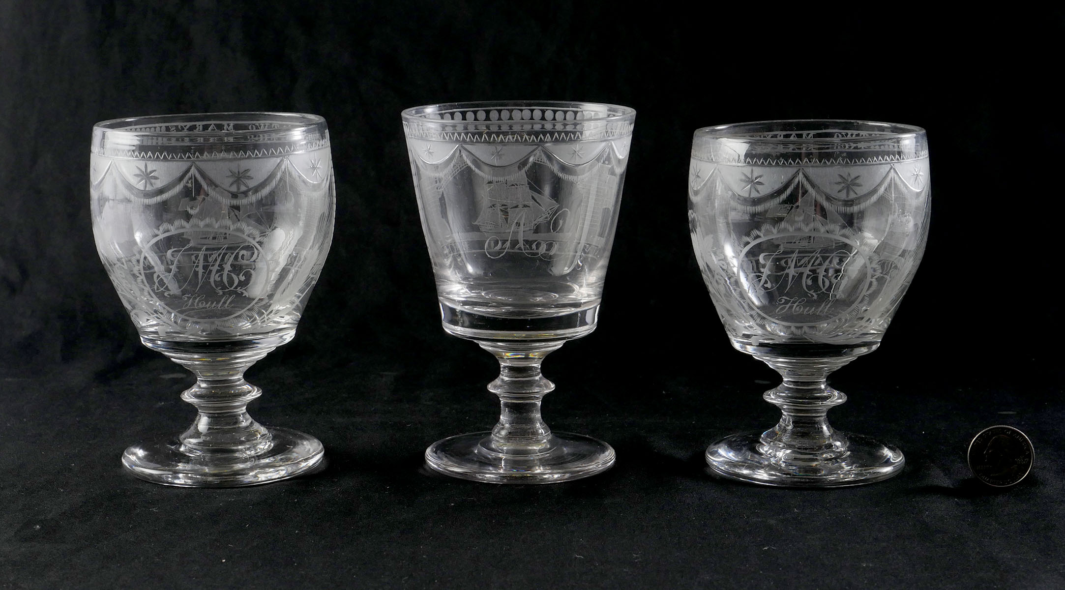3 PC. 19TH CENTURY ENGRAVED SUNERLAND BRIDGE RUMMERS: Comprising 3 leaded glass engraved Rummers, each having a different ship sailing under the Sunderland bridge. Each Rummer has the Monogram of the ship on the opposing side of glass. Engraved floral, wheat, & drapery designs flank the monograms. Monograms include; ''AY'', 2-''JMC HULL''. Approx. 5.5'' h x 3.5'' w.
