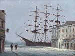 VON KLEVER, Julius, (Russian, 1850-1924): Sunrise Snowy Seaside Village Landscape, Oil/Canvas, 10.75'' x 23.75'', signed lower left and dated 1880, framed, 14.5'' x 28''. CONDITION: Relined, several touches of inpaint, small flecks of loss, paint firmly adhered, could use cleaning. |