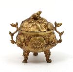 2 GILT BRONZE FOO DOGS: Set of male and female hand-chased Gilt bronze Foo Dogs. Largest Approx. 5.75'' h x 10'' l x 5.25'' w. CONDITION: Some loss of gilt, wear consistent with age and use. |