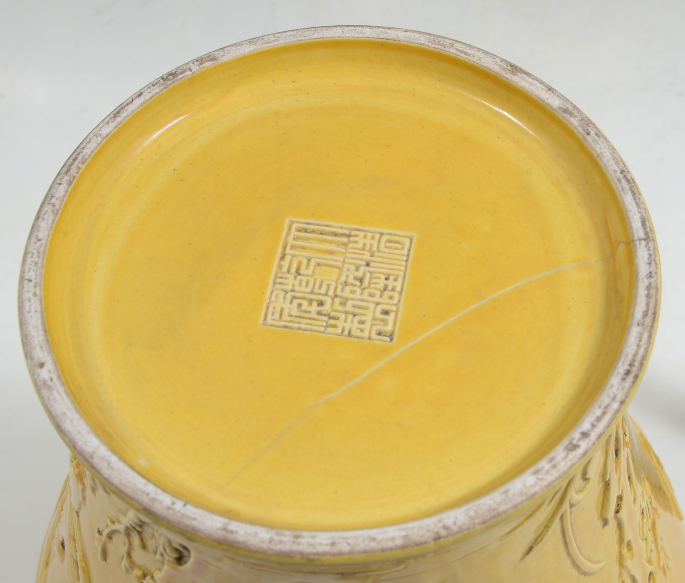 CHINESE IMPERIAL YELLOW GLAZED MEIPING VASE: Imperial yellow glazed Meiping vase having a raised encompassing Phoenix, birds, & butterflies amongst blossoming foliate design. Underside bares an impressed ''Great Qing Dynasty, Qianlong Period Make'' mark. Approx. 12.25'' h x 8'' w.