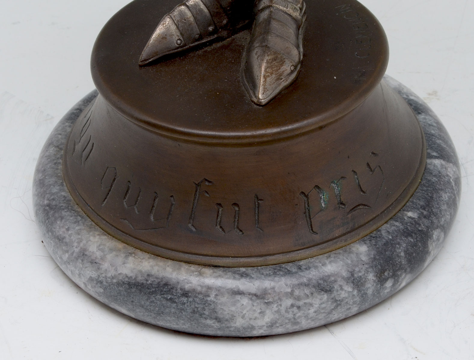 CLEMENCIN, Francois, (French, 1878-1950): Erotic Bronze and Silvered Metal Grouping of a Knight in Armor and Young Nude Nymph, 14.5'' h., affixed to marble plinth, 15.5'' overall, signed on the base.
