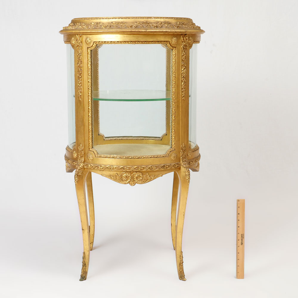 CARVED GILT ROUND VITRINE STAND: Gilt carved round Vitrine having 4 contoured glass panels. Overall ribbon, floral, & foliate carved design, 1 shelf interior with a velvet lined bottom. Raised on cabriole legs with metal mounted foliate feet. Approx. 38.5'' h x 23.5'' w.