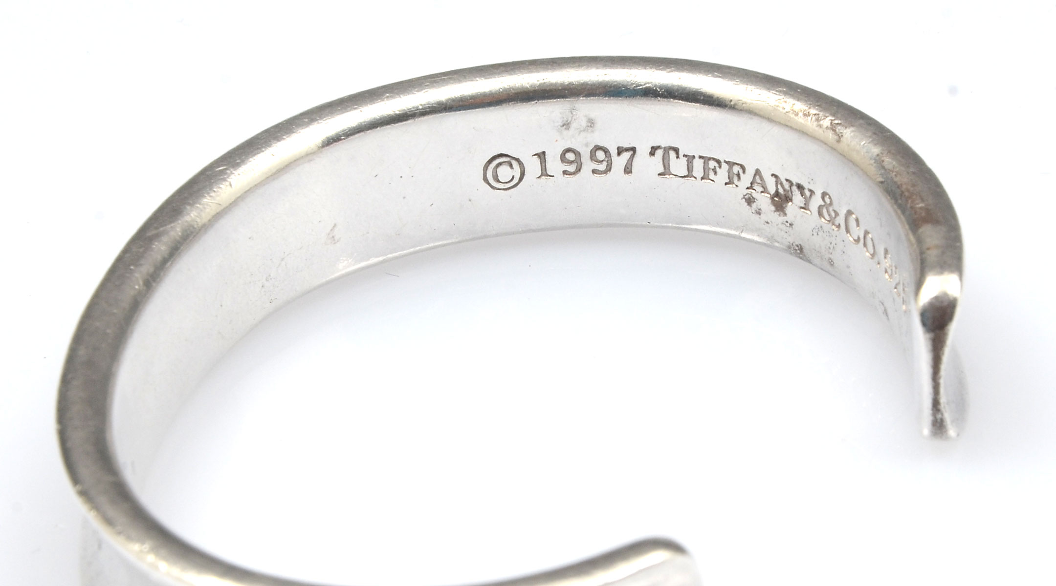 TIFFANY STERLING BRACELET - 1837 COLLECTIONS: Tiffany & Co 5'' cuff bracelet has 1'' opening and inscribed 1997 Tiffany & Co 925 inside. Approx .5'' wide. Weight approx 1.315 Troy ounces. Sold with Tiffany & Co bag and presentation box.