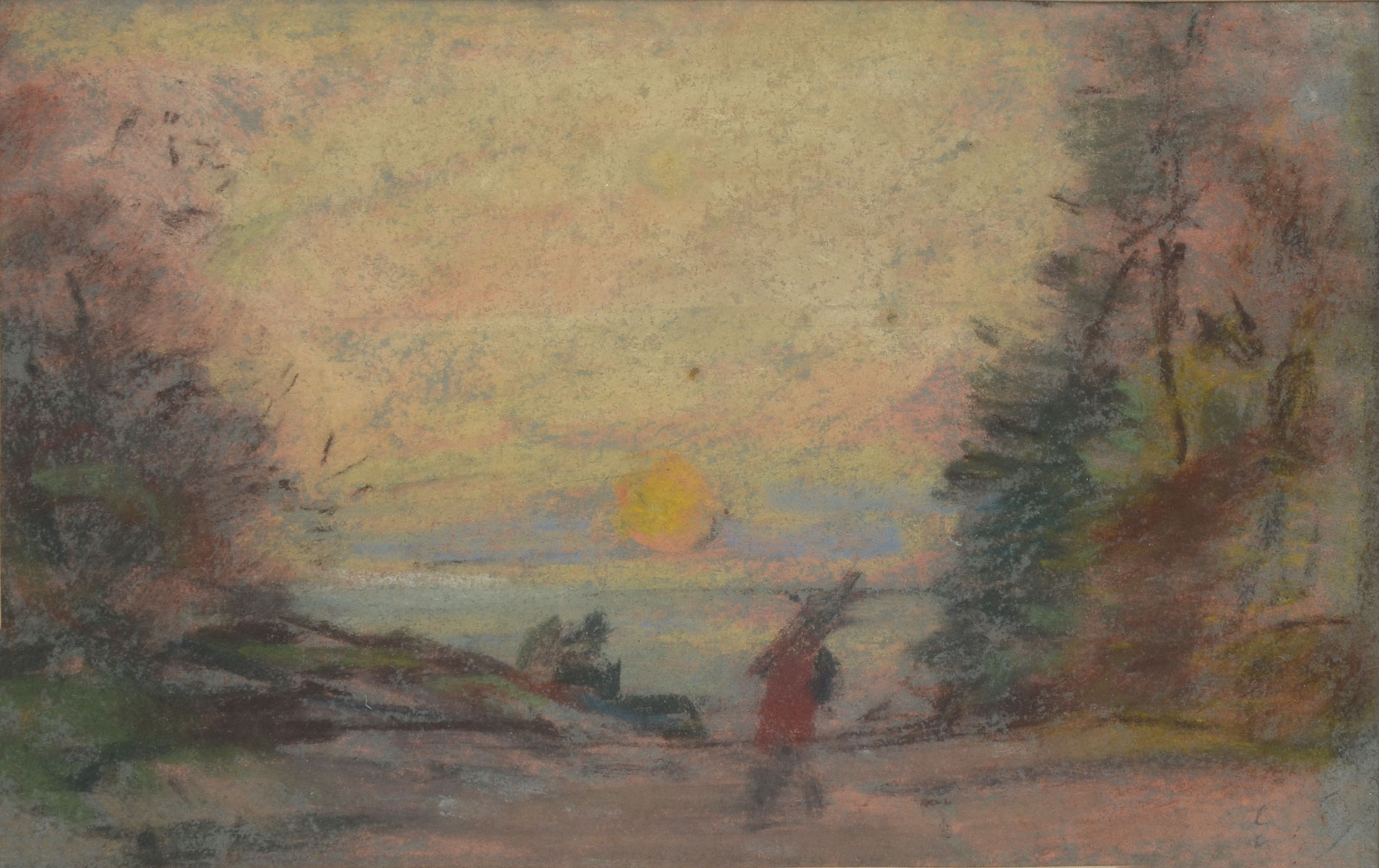 BOUDIN, Eugene, (French, 1824-1898): Landscape with Figure and Sun, Pastel, 5.25'' x 8'', monogramed lower right, framed, 14.5'' x 17'', authentication verso from Andre Pacitti, La Galerie, Paris, 1965.