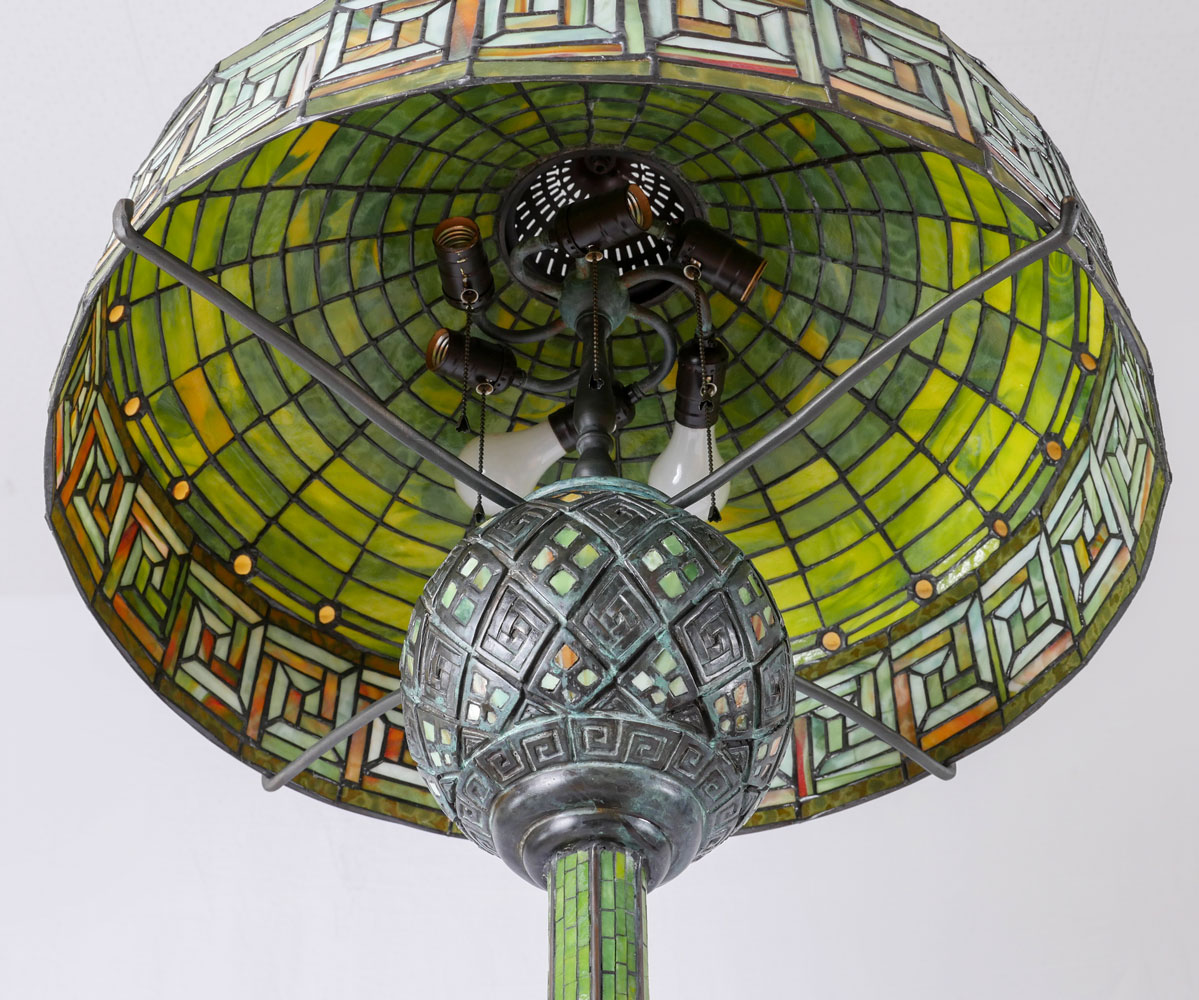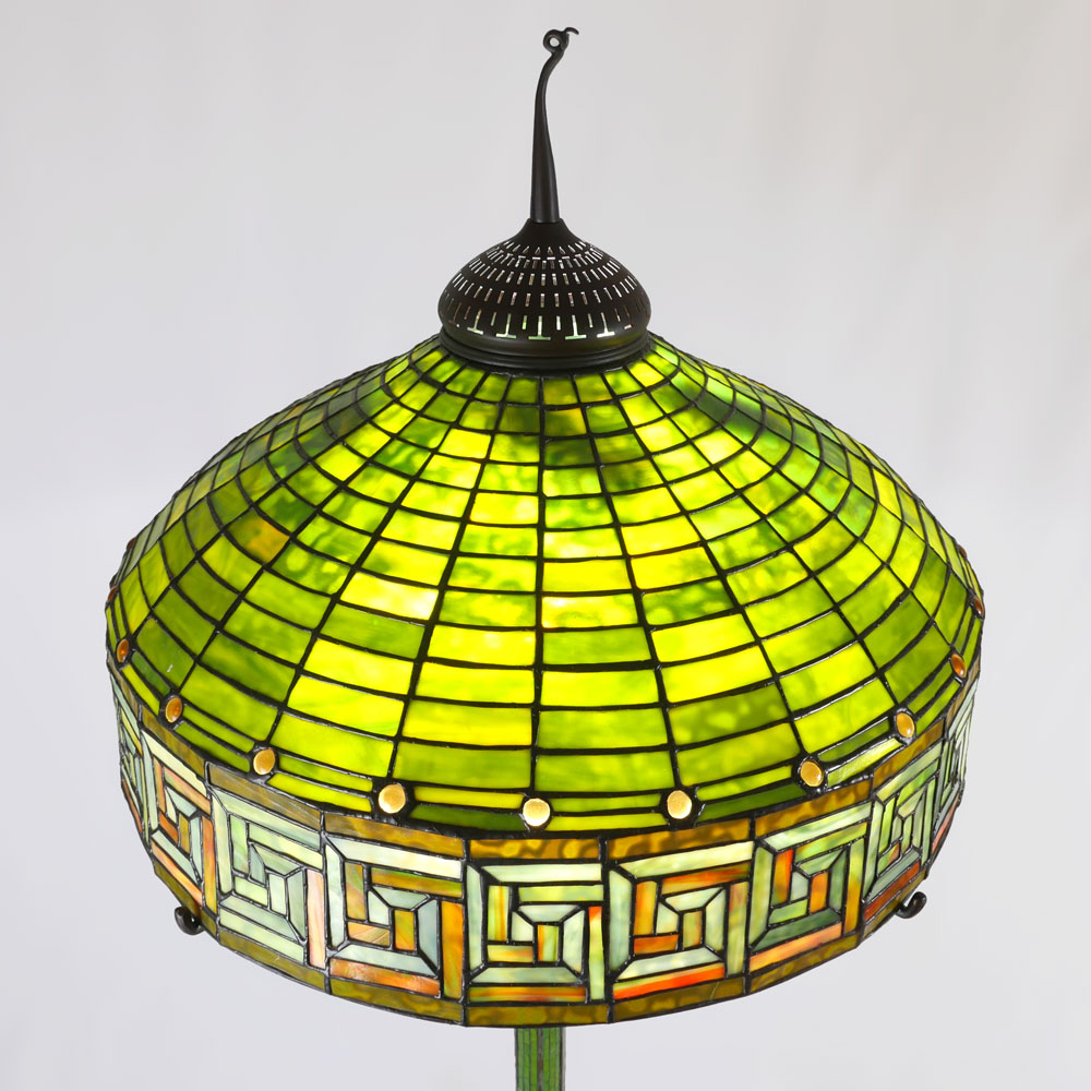 LARGE TIFFANY STYLE FLOOR LAMP: Large 6 light Tiffany style floor lamp with a pig tail finial, having a vibrant slag glass shade and a glass mosaic body and floral form mosaic base with openwork. Raised on 3 feet. Approx. 82.5'' h x 27.25'' w.