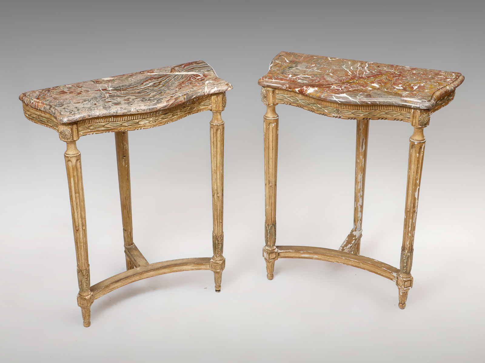 PAIR OF CARVED & GILDED MARBLE TOP SIDE TABLES: Beveled marble top over a carved & gilt foliate motif frame, raised on fluted & foliate legs. Approx. 32.75'' h x 27.75'' l x 14.75'' w.