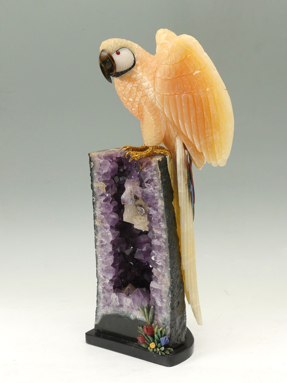 GEM CARVED PARROT ON AMETHYST GEODE: Body is of Aragonite, cheeks are if white Opalized Agate, Garnet eyes, Tiger eye beak. Mounted to an Amethyst geode with a lower multi gem foliate. Created by Pedras. Approx. 24.25'' h x 12.2'' l x 11'' w.