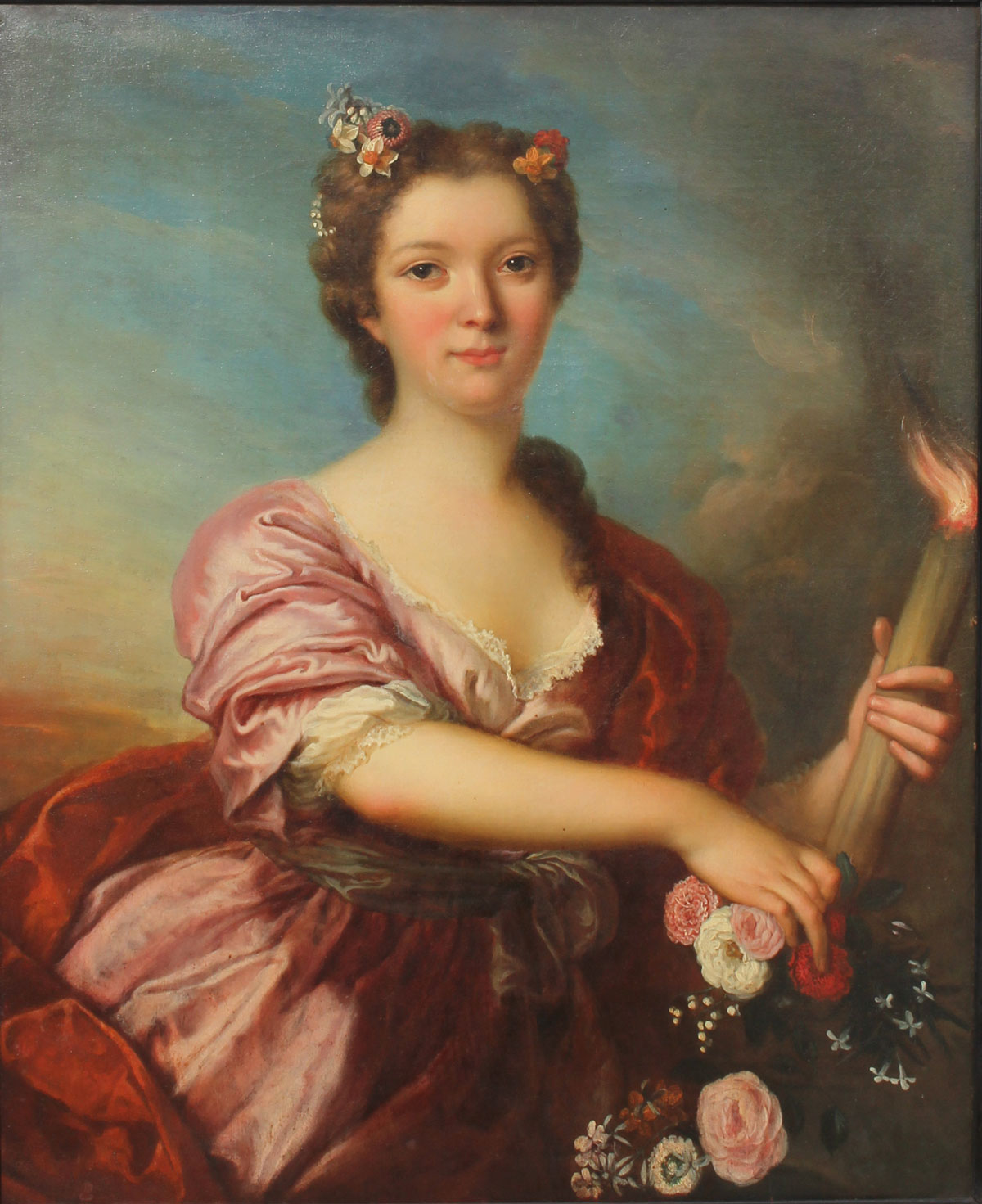 PORTRAIT OF A YOUNG BEAUTY AFTER NATTIER: Depicts the Young Women with Flowers in Her Hair Holding a Torch, Oil/Canvas, 33.75'' x 28.25'', period gilded gesso frame 41.50'' x 35.25''.