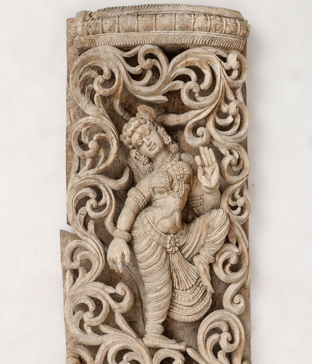 INDONESIAN HIGH RELIEF FIGURAL CARVED PANEL: Carved of solid wood, High relief scrolling foliate with 3 deity figures and a mythological beast having the body of a tiger and the head of an elephant. Approx. 59.25'' h x 13'' l x 4.25'' w.