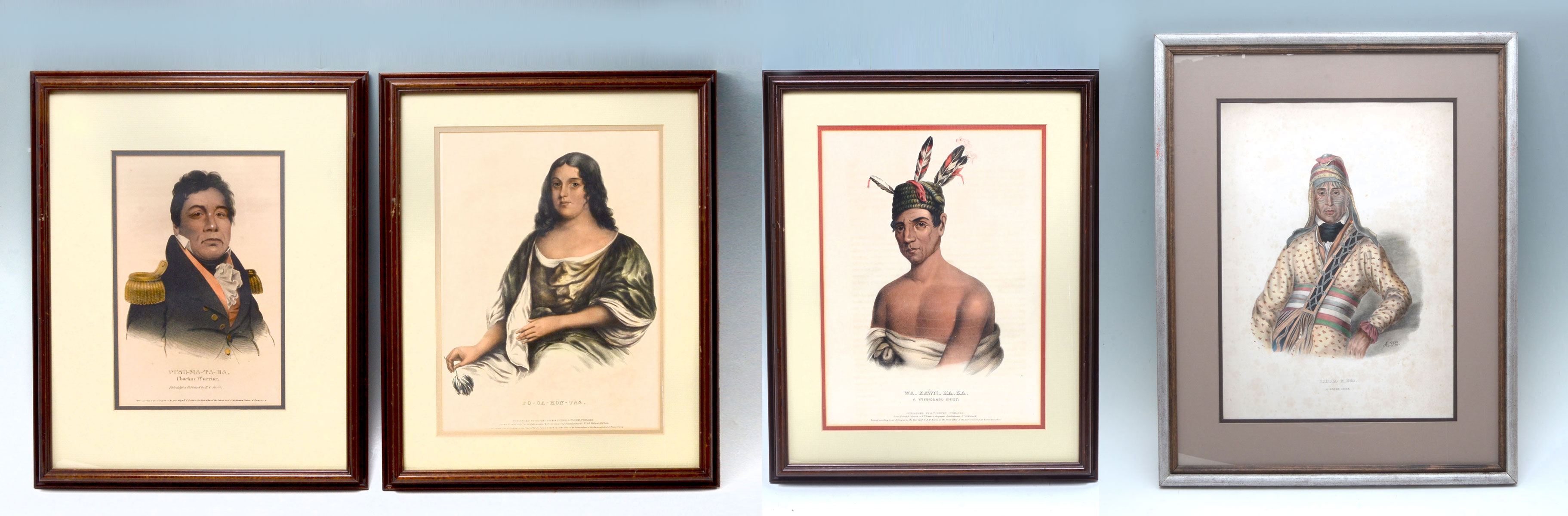 4 PC NATIVE AMERICAN INDIAN PRINT LOT: 1) ''Yoholo-Micco'', A Creek Chief, Lithograph, sight size 18.25'' x 14.25'', monogramed in the plate A.H., framed, 26.5'' x 22.25''; 2) Pocahontas, Lithograph printed by Daniel Rice and James Clark, 1842, sight size 14.75'' x 10.75'', framed, 20.5'' x 17''; 3) ''Push-Ma-Ha-Ta'', Chactan Warrior, Lithograph published by E.C. Riddle, sight size 12.25'' x 8'', framed, 20.5'' x 17''; 4) ''Wa-Kawn-Ha-Ka'', Lithograph printed J.T. Bowen, sight size 14.75'' x 10.5'', framed, 20.5'' x 17''.