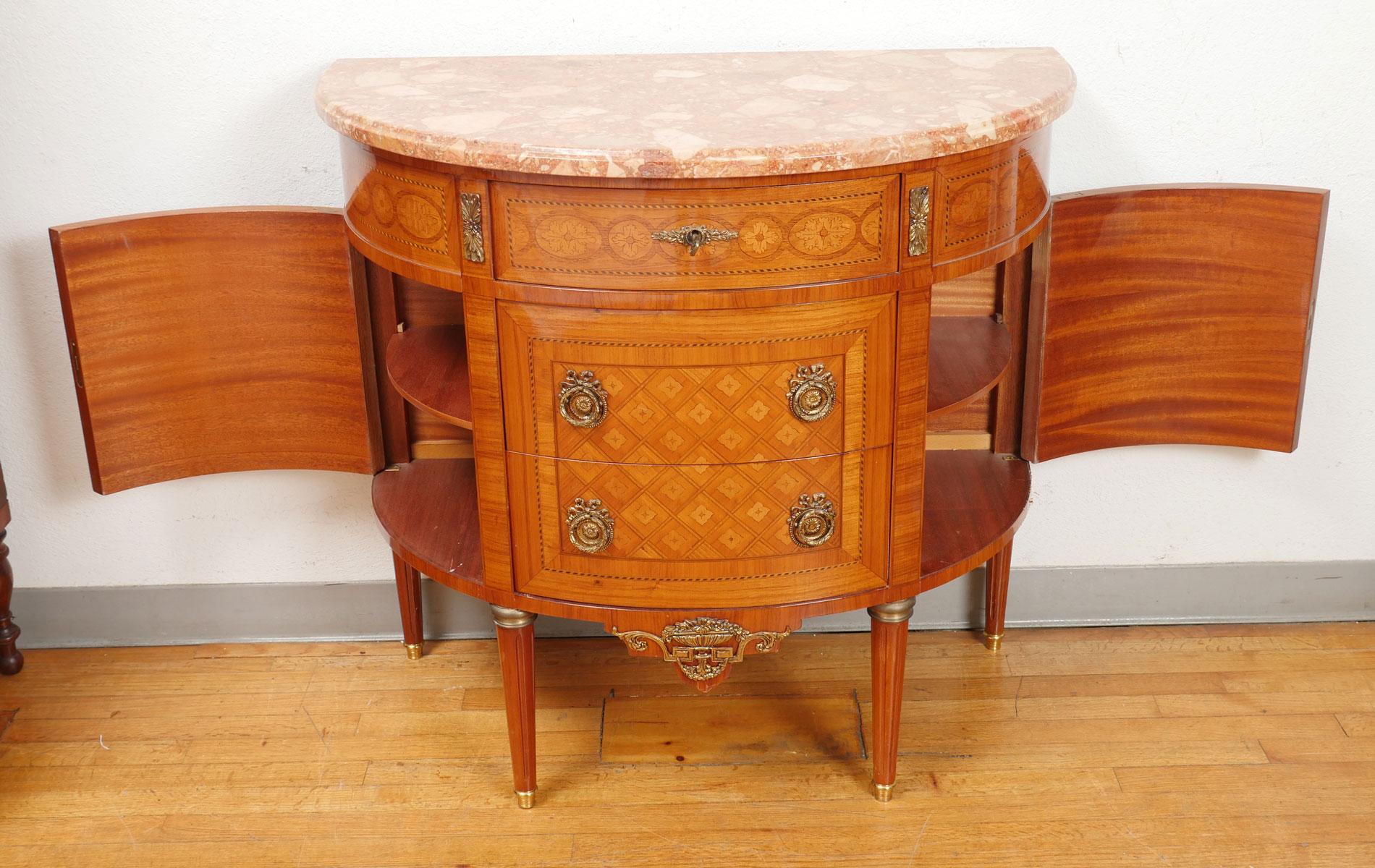 FRENCH PARQUETRY INLAID MARBLE TOP DEMILUNE: Parquetry inlaid French Demilune having single door over 2 drawers flanked by contoured side doors with single shelf interiors. Raised on fluted legs with metal covered feet. Attached metal foliate medallions adorning, Brass foliate & ribbon drop handles. Approx. 35.75'' h x 38.5'' l x 20'' w.