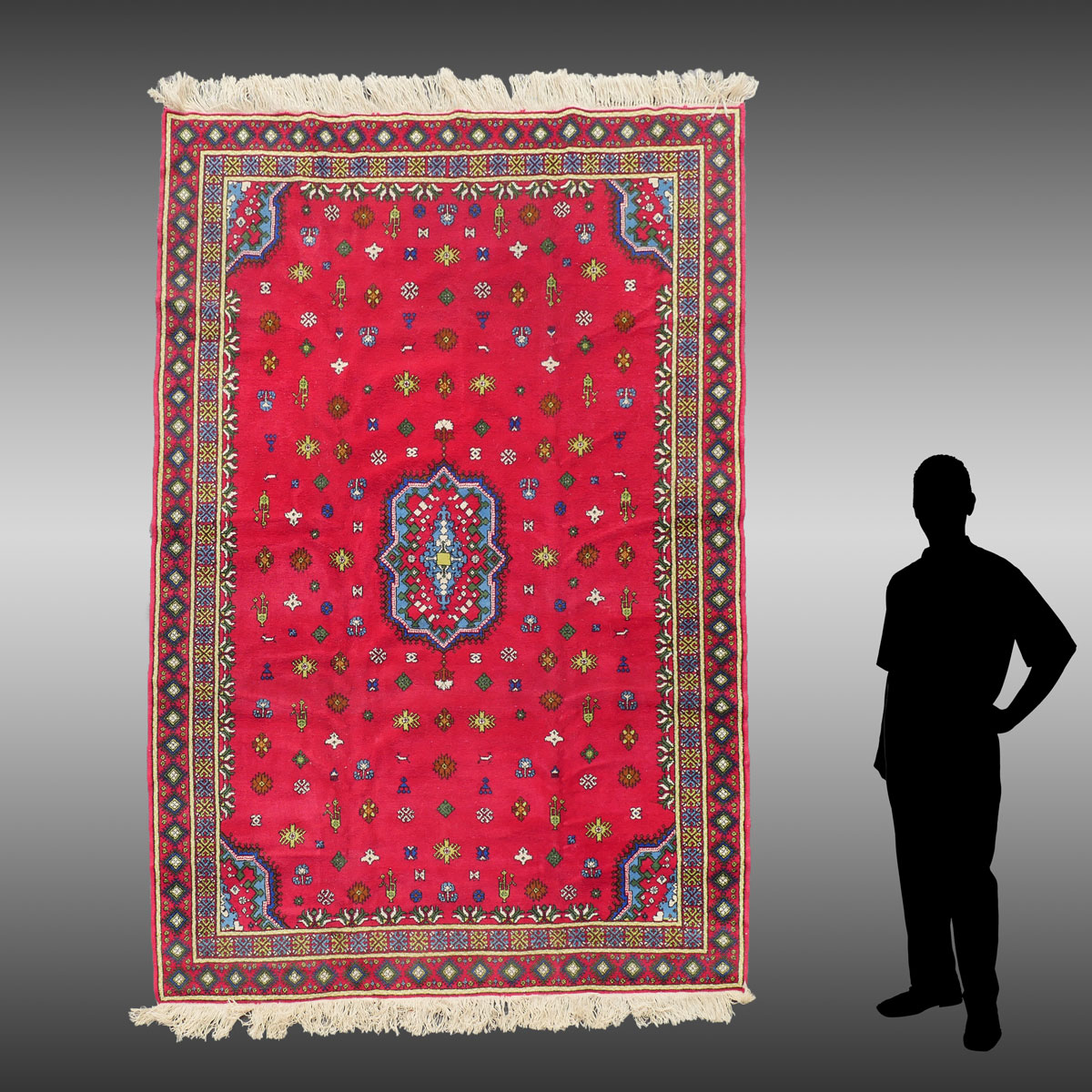 TURKISH HAND KNOTTED WOOL RUG, 6'9'' X 8'11'': The striking hot pink field has a small central medallion and rows of small motifs including ewers, diamonds, and animals.