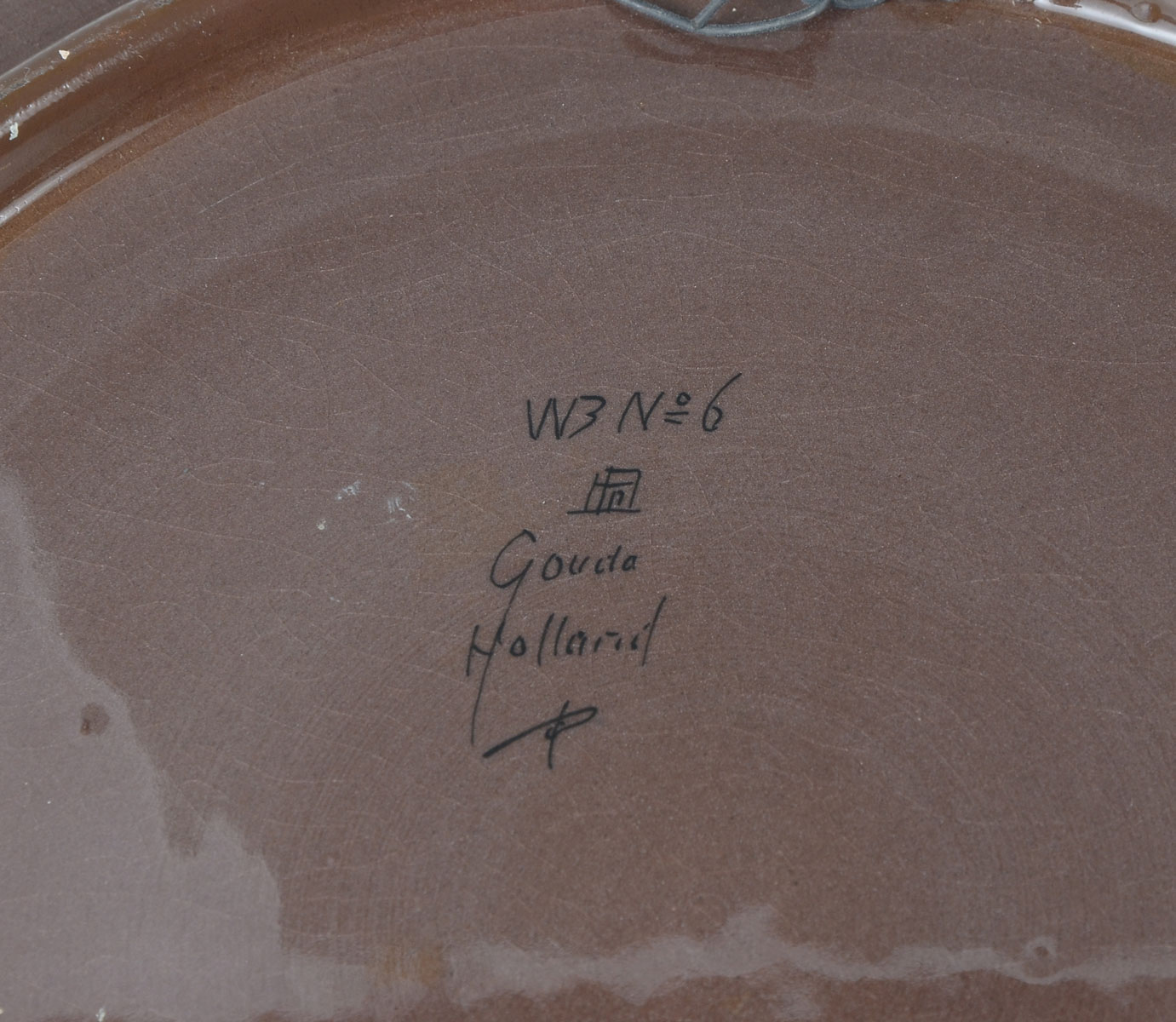 3 PIECE DUTCH GOUDA CHARGERS: Comprising; 1 Floral & foliate charger having brown ground, marked at verso, 1 Deep Blue ground charger with ''Werken is Leven'' at center, 1 matte glazed foliate designed charger marked on verso Rhodian, Gouda, Holland. Largest Approx. 2.25'' h x 14.25'' w.