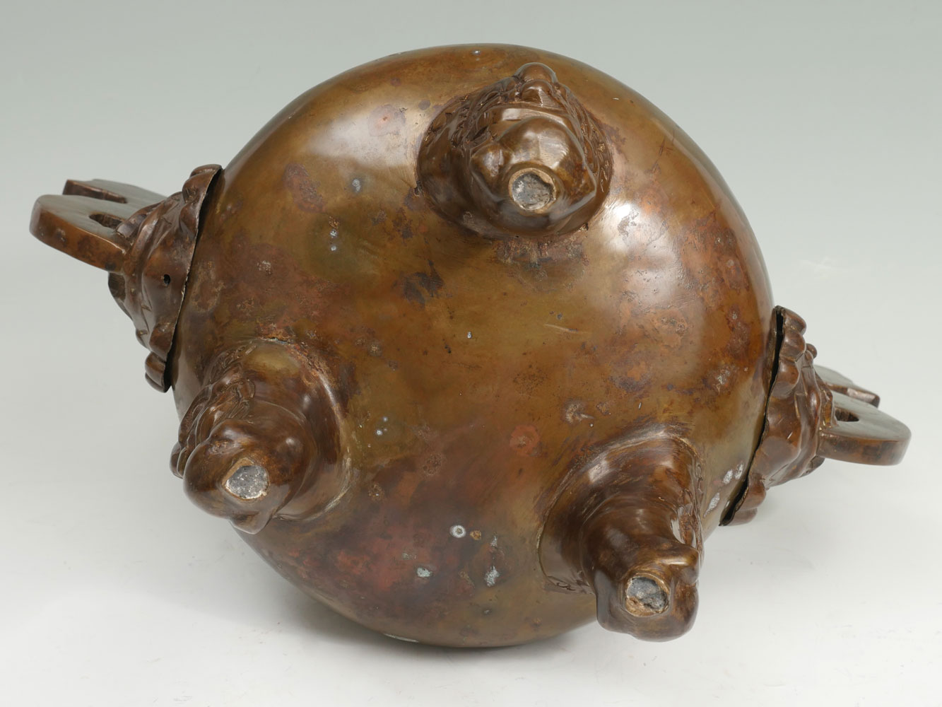 LARGE BRONZE CHINESE KORO/CENSOR: Large Bronze Koro/Censor with a surmounting horned Foo Dog with paw on ball, mounted to lid. Attached dragon head with incised smoke handles. Raised on cabriole Foo Dog legs. Approx. 23.5'' h x 20.75'' l x 13'' w.
