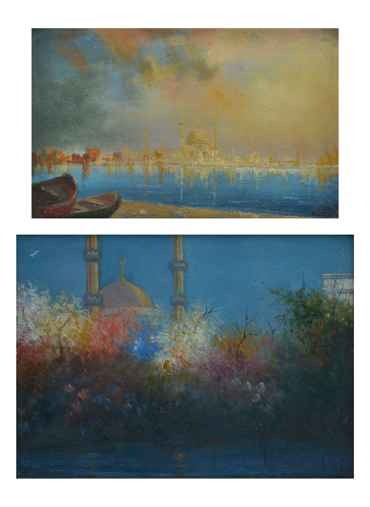 PAIR OF FINELY PAINTED TURN OF THE CENTURY VENICE PAINTINGS: 1. Scene of Two Towers and a Dome Through Trees, Oil/Canvas Board, 8.75'' x 11.75'', signed lower right Peluso?, under glass, framed 15'' x 18''. 2. Grand Canal Venice, Oil/Canvas Board, 7'' x 12'', signed lower right Peluso, framed 11.50'' x 16.50''.